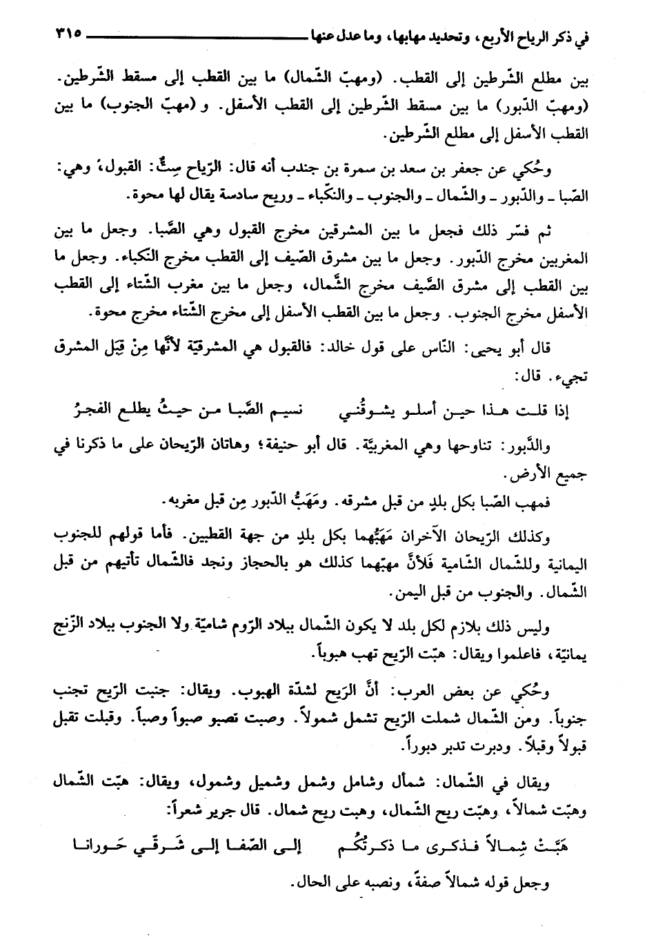 وكذلك الرّيحان الآخران مهبّهما بكل بلد من جهة القطبين. فأما قولهم للجنوب اليمانية وللشّمال الشّامية فلأنّ مهبّهما كذلك هو بالحجاز ونجد فالشّمال تأتيهم من قبل الشّمال. والجنوب من قبل اليمن.