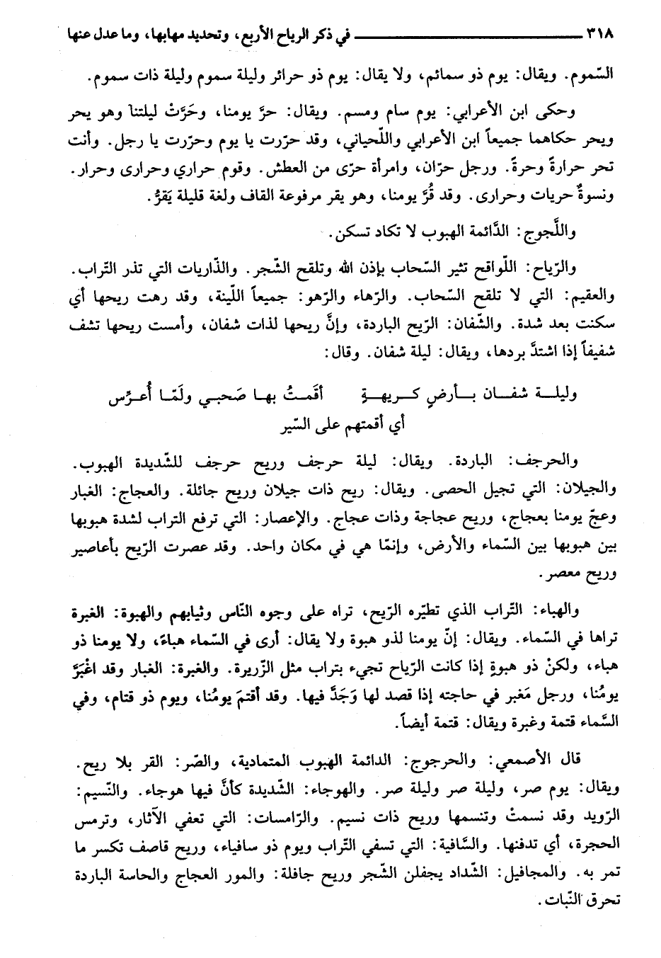 الرّويد وقد نسمت وتنسمها وريح ذات نسيم. والرّامسات: التي تعفي الآثار، وترمس الحجرة، أي تدفنها. والسّافية: التي تسفي التّراب ويوم ذو سافياء، وريح قاصف تكسر ما تمر به. والمجافيل: الشّداد يجفلن الشّجر وريح جافلة: والمور العجاج والحاسة الباردة تحرق النّبات.