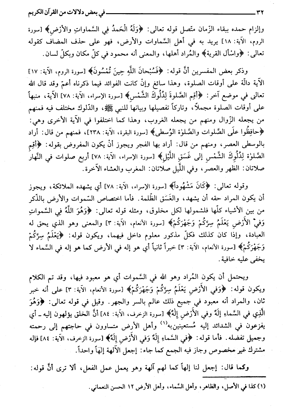 [سورة الإسراء، الآية: 78] أي يشهده الملائكة، ويجوز أن يكون المراد حقه أن يشهد، والغسق الظّلمة. فأما اختصاص السّماوات والأرض بالذّكر من بين الأشياء كلّها فلشمولها لكل مخلوق، ومثله قوله تعالى: وَهُوَ اللَّهُ فِي السَّماواتِ وَفِي الْأَرْضِ يَعْلَمُ سِرَّكُمْ وَجَهْرَكُمْ