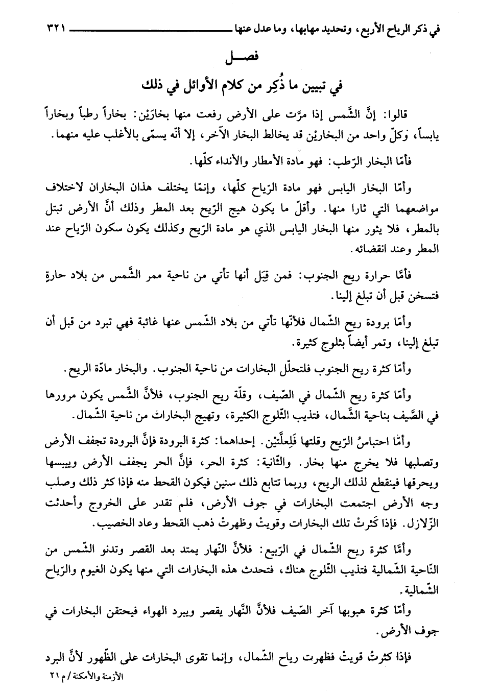 وأمّا البخار اليابس فهو مادة الرّياح كلّها، وإنّما يختلف هذان البخاران لاختلاف مواضعهما التي ثارا منها. وأقلّ ما يكون هيج الرّيح بعد المطر وذلك أنّ الأرض تبتل بالمطر، فلا يثور منها البخار اليابس الذي هو مادة الرّيح وكذلك يكون سكون الرّياح عند المطر وعند انقضائه.