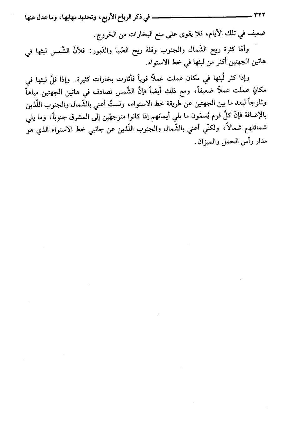 وإذا كثر لبثها في مكان عملت عملا قويا فأثارت بخارات كثيرة. وإذا قلّ لبثها في مكان عملت عملا ضعيفا، ومع ذلك أيضا فإنّ الشّمس تصادف في هاتين الجهتين مياها وثلوجا لبعد ما بين الجهتين عن طريقة خط الاستواء، ولست أعني بالشّمال والجنوب اللّذين بالإضافة فإنّ كلّ قوم يسمّون ما يلي أيمانهم إذا كانوا متوجّهين إلى المشرق جنوبا، وما يلي شمائلهم شمالا، ولكنّي أعني بالشّمال والجنوب اللّذين عن جانبي خط الاستواء الذي هو مدار رأس الحمل والميزان.