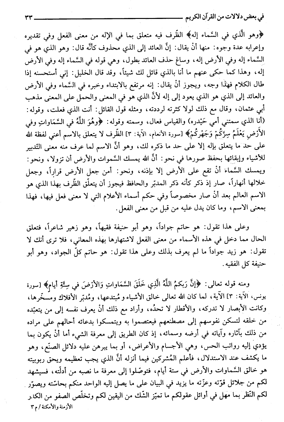 [سورة الأنعام، الآية: 3] الظّرف لا يتعلق بالاسم أعني لفظة الله على حد ما يتعلق بإله إلا على حد ما ذكره لك، وهو أنّ الاسم لما عرف منه معنى التّدبير للأشياء وإبقائها بحفظ صورها في نحو: أنّ الله يمسك السّماوات والأرض أن تزولا، ونحو: