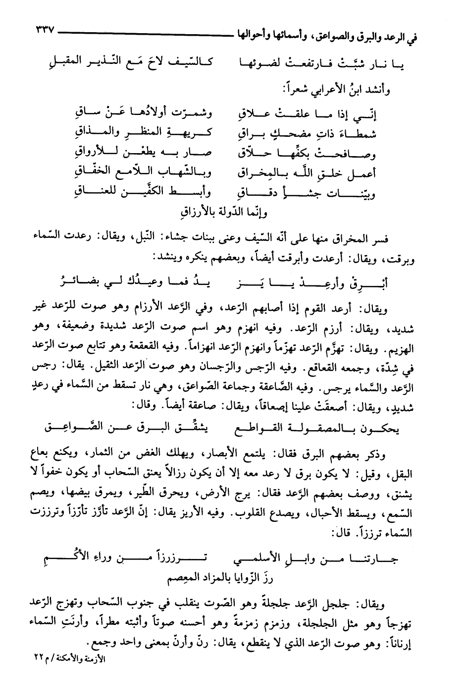 ويقال: أرعد القوم إذا أصابهم الرّعد، وفي الرّعد الأرزام وهو صوت للرّعد غير شديد، ويقال: أرزم الرّعد. وفيه انهزم وهو اسم صوت الرّعد شديدة وضعيفة، وهو الهزيم. ويقال: تهزّم الرّعد تهزّما وانهزم الرّعد انهزاما. وفيه القعقعة وهو تتابع صوت الرّعد في شدّة، وجمعه القعاقع. وفيه الرّجس والرّجسان وهو صوت الرّعد الثقيل. يقال: رجس الرّعد والسّماء يرجس. وفيه الصّاعقة وجماعة الصّواعق، وهي نار تسقط من السّماء في رعد شديد، ويقال: أصعقت علينا إصعاقا، ويقال: صاعقة أيضا. وقال: