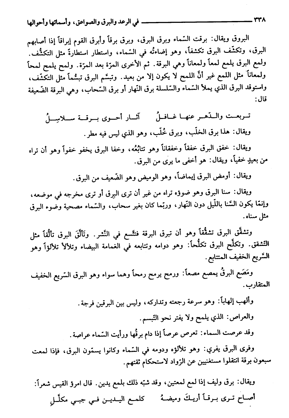 ولمع البرق يلمع لمعا ولمعانا وهي البرقة. ثم الأخرى المرّة بعد المرّة. ولمح يلمح لمحا ولمعانا مثل اللمع غير أنّ اللمح لا يكون إلا من بعيد. وتبسّم البرق تبسّما مثل التكشّف، واستوقد البرق الذي يملأ السّماء والسّلسلة برق النّهار أو برق السّحاب، وهي البرقة الضّعيفة قال:
