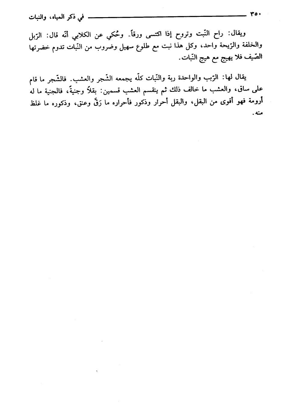 يقال لها: الرّبب والواحدة ربة والنّبات كلّه يجمعه الشّجر والعشب. فالشّجر ما قام على ساق، والعشب ما خالف ذلك ثم ينقسم العشب قسمين: بقلا وجنية، فالجنية ما له أرومة فهو أقوى من البقل، والبقل أحرار وذكور فأحراره ما رقّ وعنق، وذكوره ما غلظ منه.