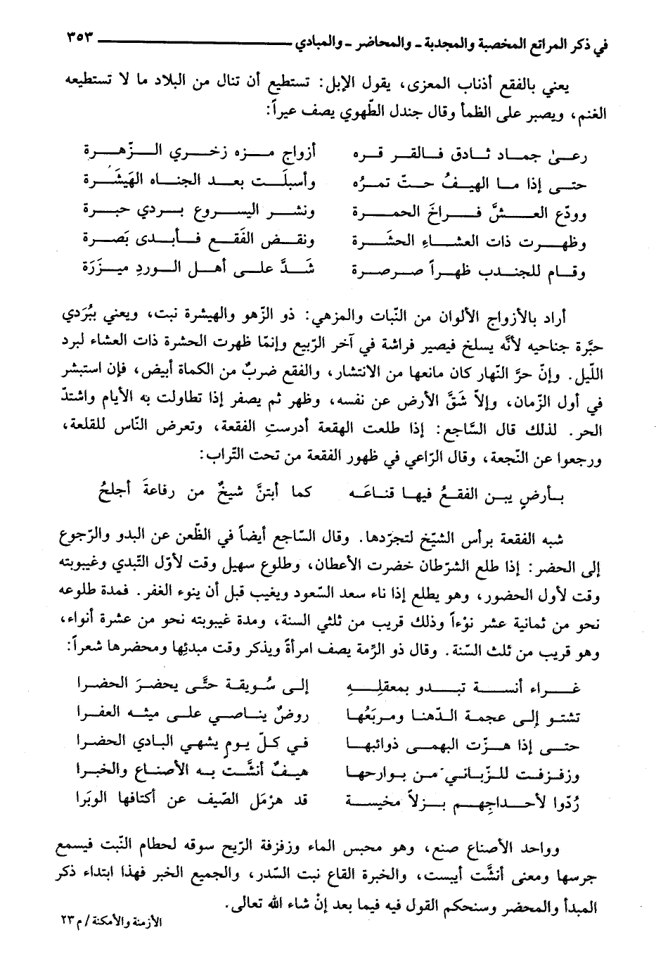 شبه الفقعة برأس الشّيخ لتجرّدها. وقال السّاجع أيضا في الظّعن عن البدو والرّجوع إلى الحضر: إذا طلع الشّرطان خضرت الأعطان، وطلوع سهيل وقت لأوّل التّبدي وغيبوبته وقت لأول الحضور، وهو يطلع إذا ناء سعد السّعود ويغيب قبل أن ينوء الغفر. فمدة طلوعه نحو من ثمانية عشر نوءا وذلك قريب من ثلثي السنة، ومدة غيبوبته نحو من عشرة أنواء، وهو قريب من ثلث السّنة. وقال ذو الرّمة يصف امرأة ويذكر وقت مبدئها ومحضرها شعرا:
