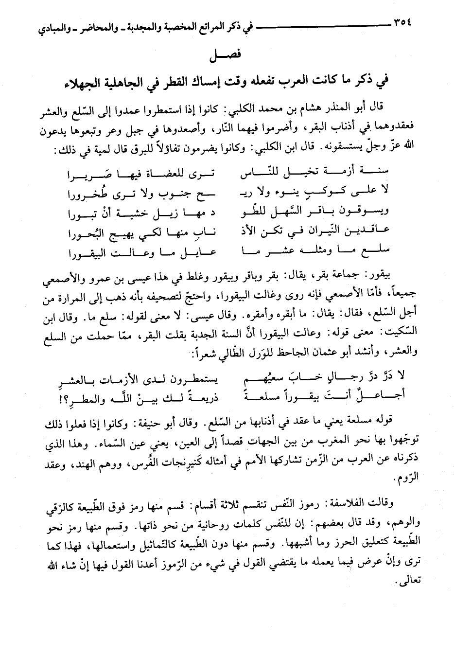 قوله مسلعة يعني ما عقد في أذنابها من السّلع. وقال أبو حنيفة: وكانوا إذا فعلوا ذلك توجّهوا بها نحو المغرب من بين الجهات قصدا إلى العين، يعني عين السّماء. وهذا الذي ذكرناه عن العرب من الزّمن تشاركها الأمم في أمثاله كنيرنجات الفرس، ووهم الهند، وعقد الرّوم.