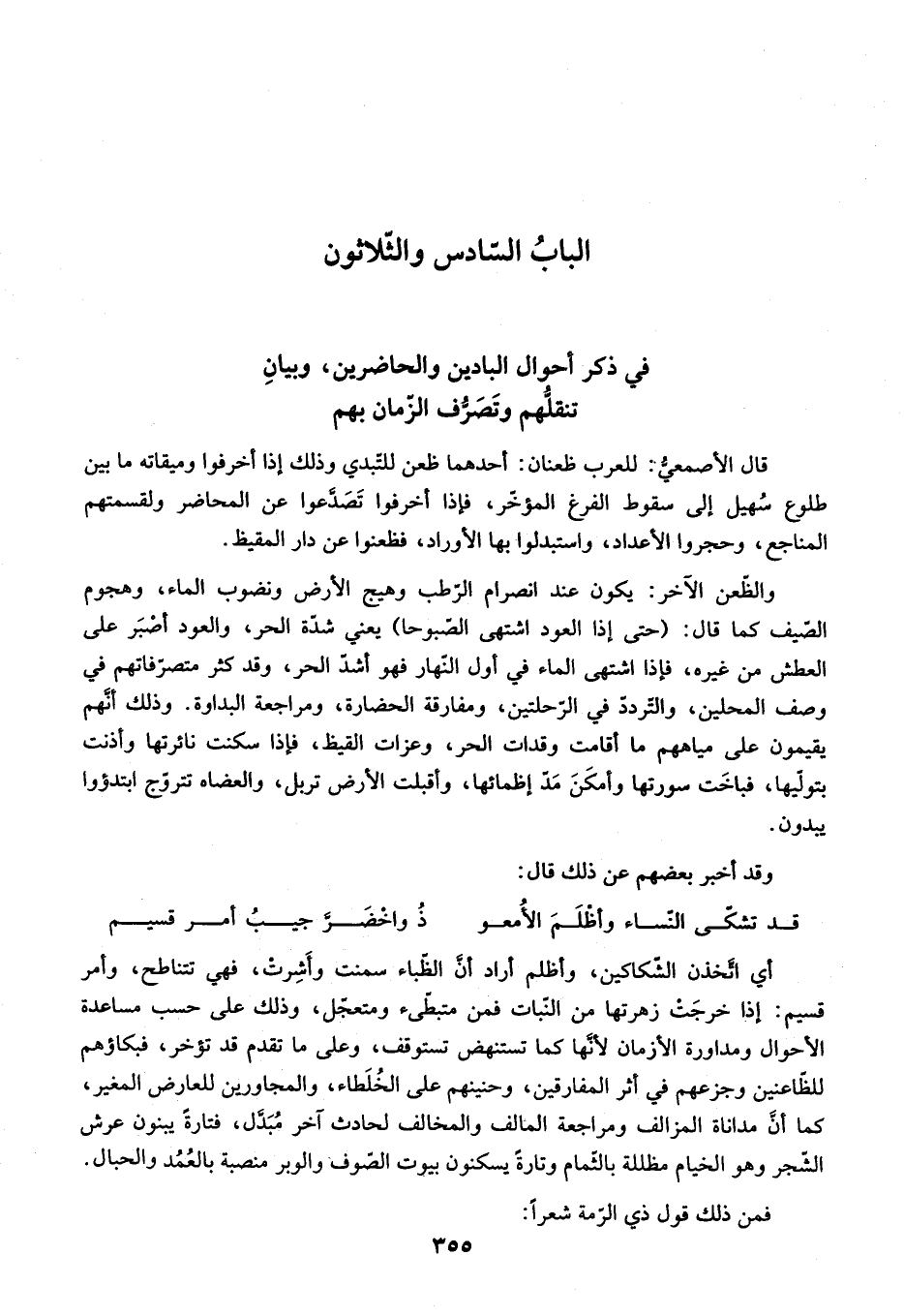 والظّعن الآخر: يكون عند انصرام الرّطب وهيج الأرض ونضوب الماء، وهجوم الصّيف كما قال: (حتى إذا العود اشتهى الصّبوحا) يعني شدّة الحر، والعود أصبر على العطش من غيره، فإذا اشتهى الماء في أول النّهار فهو أشدّ الحر، وقد كثر متصرّفاتهم في وصف المحلين، والتّردّد في الرّحلتين، ومفارقة الحضارة، ومراجعة البداوة. وذلك أنّهم يقيمون على مياههم ما أقامت وقدات الحر، وعزات القيظ، فإذا سكنت نائرتها وأذنت بتولّيها، فباخت سورتها وأمكن مدّ إظمائها، وأقبلت الأرض تربل، والعضاه تتروّج ابتدؤوا يبدون.
