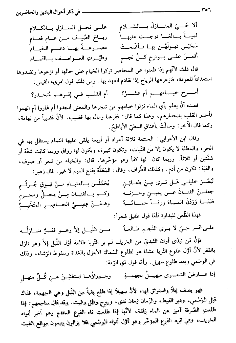 فهو يصف إبلا واستوثق لها، لأنّ سهيلا إذا طلع بقية من اللّيل وهي الجهمة، فذاك قبل الوسمي، ودبر القيظ، والزّمان زمان ندى، وروح وطل وغيث. وقد قال ساجعهم: إذا طلعت الصّرفة أميز عن الماء زلفة، لأنّها إذا طلعت ناء الفرع المقدم وهو آخر أنواء الخريف، وفي اثره الفرع المؤخّر وهو أوّل أنواء الوسمي فلا يزالون يتبعون مواقع الغيث