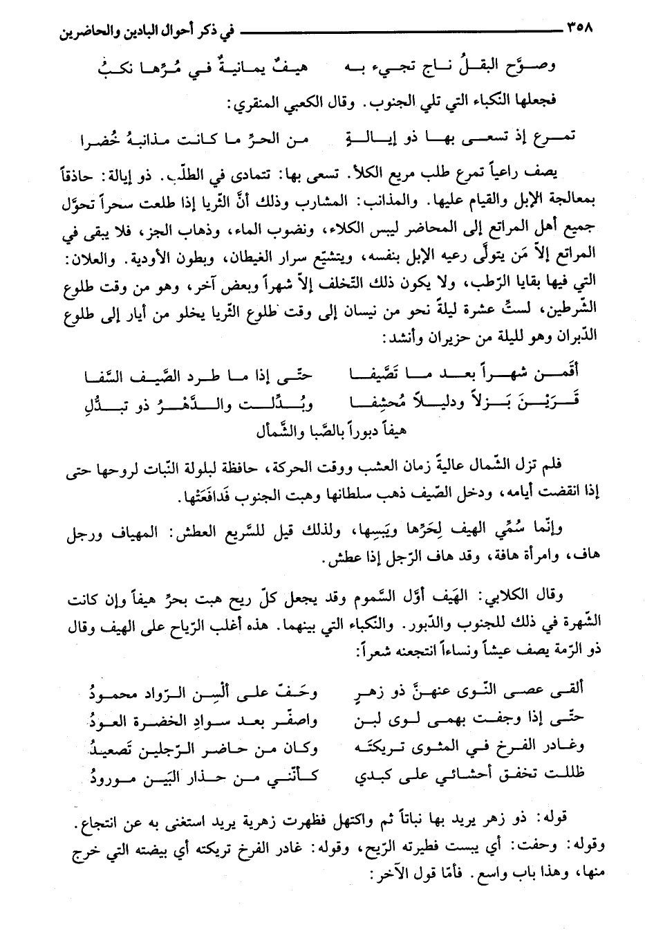 فلم تزل الشّمال عالية زمان العشب ووقت الحركة، حافظة لبلولة النّبات لروحها حتى إذا انقضت أيامه، ودخل الصّيف ذهب سلطانها وهبت الجنوب فدافعتها.
