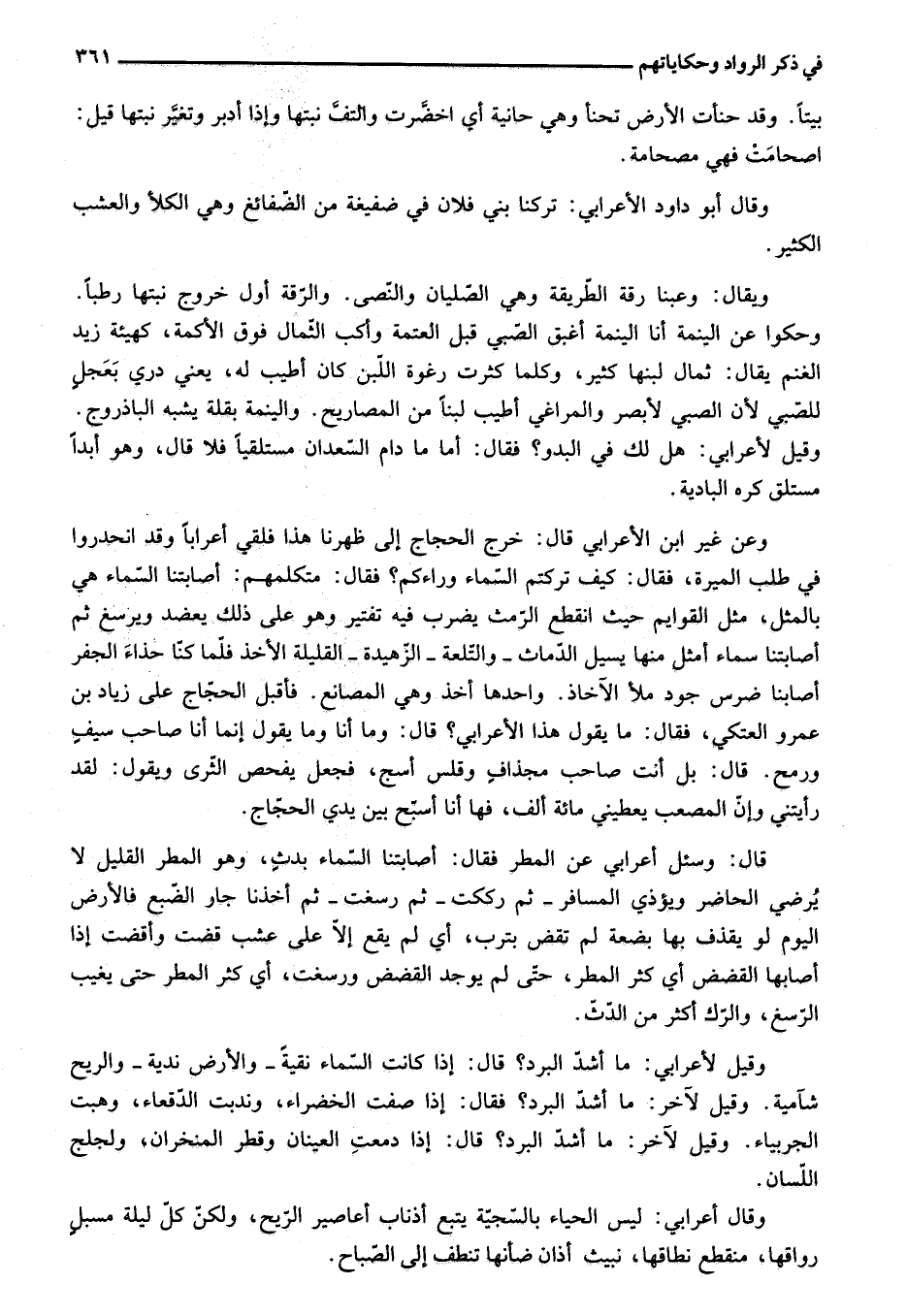 وعن غير ابن الأعرابي قال: خرج الحجاج إلى ظهرنا هذا فلقي أعرابا وقد انحدروا في طلب الميرة، فقال: كيف تركتم السّماء وراءكم؟ فقال: متكلمهم: أصابتنا السّماء هي بالمثل، مثل القوائم حيث انقطع الرّمث يضرب فيه تفتير وهو على ذلك يعضد ويرسغ ثم أصابتنا سماء أمثل مهنا يسيل الدّماث- والتّلعة- الزّهيدة- القليلة الأخذ فلّما كنّا حذاء الجفر أصابنا ضرس جود ملأ الآخاذ. واحدها أخذ وهي المصانع. فأقبل الحجّاج على زياد بن عمرو العتكي، فقال: ما يقول هذا الأعرابي؟ قال: وما أنا وما يقول إنما أنا صاحب سيف ورمح. قال: بل أنت صاحب مجذاف وقلس أسج، فجعل يفحص الثّرى ويقول: لقد رأيتني وإنّ المصعب يعطيني مائة ألف، فها أنا أسبّح بين يدي الحجّاج.