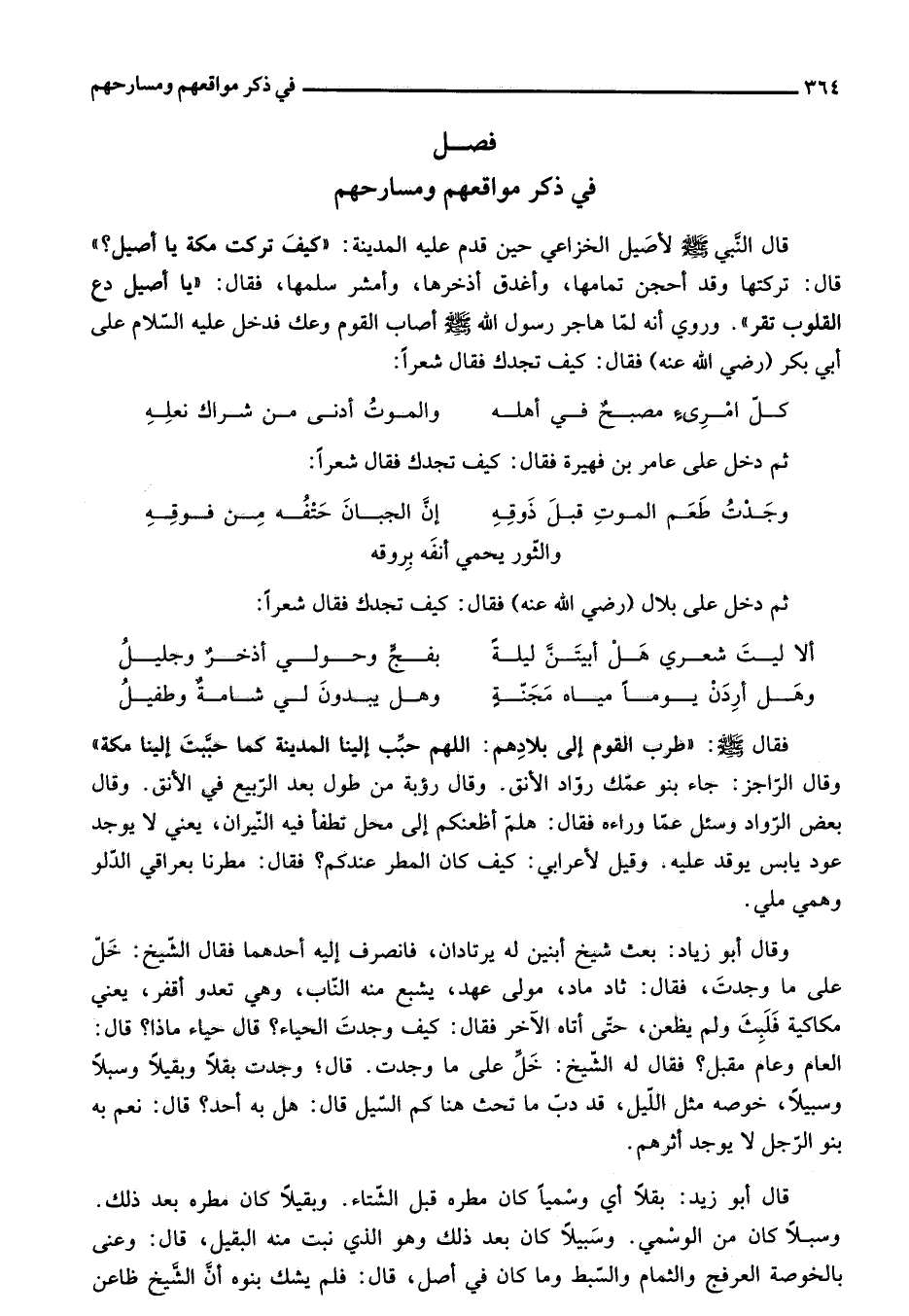قال النّبي صلى الله عليه وسلم لأصيل الخزاعي حين قدم عليه المدينة: «كيف تركت مكة يا أصيل؟» قال: تركتها وقد أحجن تمامها، وأغدق أذخرها، وأمشر سلمها، فقال: «يا أصيل دع القلوب تقر» . وروي أنه لمّا هاجر رسول الله صلى الله عليه وسلم أصاب القوم وعك فدخل عليه السّلام على أبي بكر (رضي الله عنه) فقال: كيف تجدك فقال شعرا:
