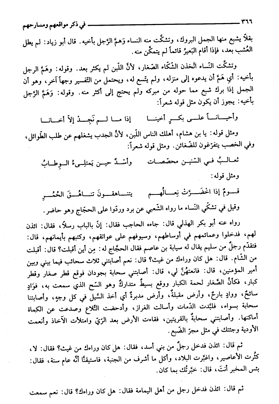 ومثل قوله: يا بن هشام، أهلك الناس اللّبن، لأنّ الجدب يشغلهم عن طلب الطّوائل، وفي الخصب يتفرّغون للضّغائن. ومثل قوله شعرا: