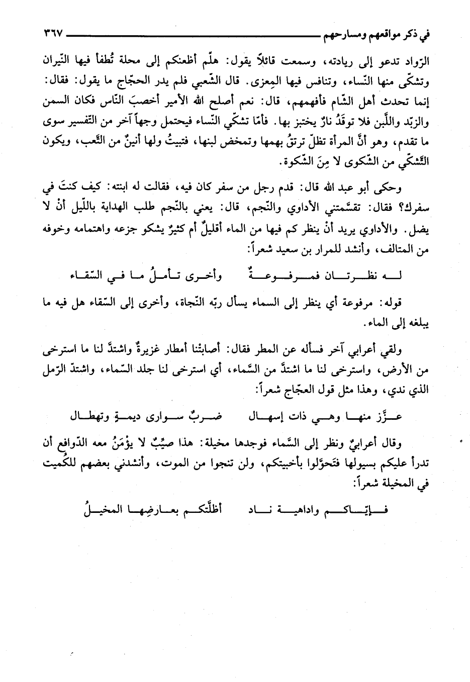 وحكى أبو عبد الله قال: قدم رجل من سفر كان فيه، فقالت له ابنته: كيف كنت في سفرك؟ فقال: تقسّمتني الأداوي والنّجم، قال: يعني بالنّجم طلب الهداية باللّيل أن لا يضل. والأداوي يريد أن ينظر كم فيها من الماء أقليل أم كثير يشكو جزعه واهتمامه وخوفه من المتالف، وأنشد للمرار بن سعيد شعرا: