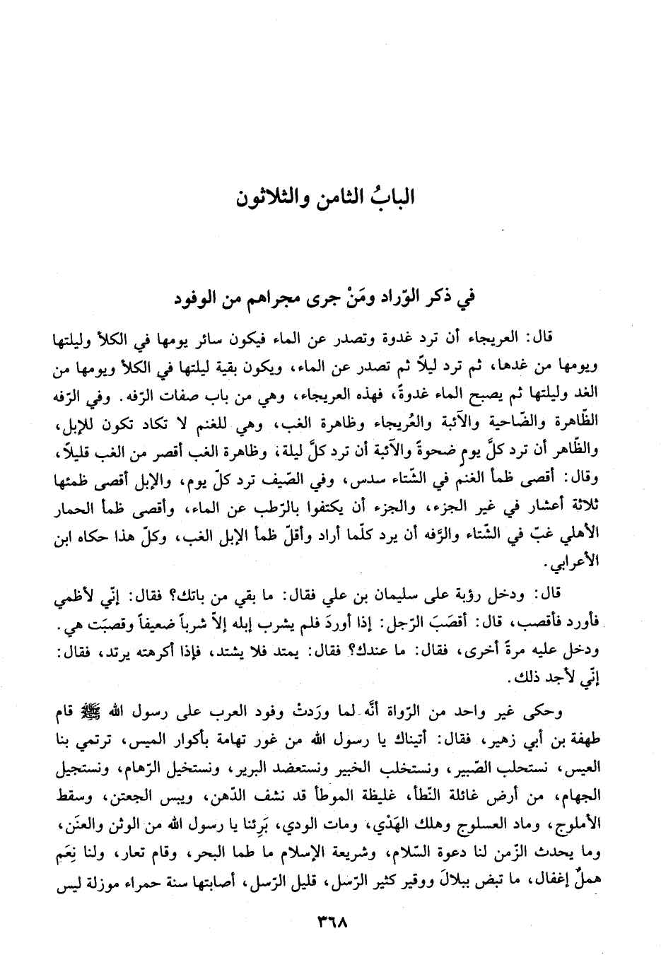 قال: العريجاء أن ترد غدوة وتصدر عن الماء فيكون سائر يومها في الكلأ وليلتها ويومها من غدها، ثم ترد ليلا ثم تصدر عن الماء، ويكون بقية ليلتها في الكلأ ويومها من الغد وليلتها ثم يصبح الماء غدوة، فهذه العريجاء، وهي من باب صفات الرّفه. وفي الرّفه الظّاهرة والضّاحية والآئبة والعريجاء وظاهرة الغب، وهي للغنم لا تكاد تكون للإبل، والظّاهر أن ترد كلّ يوم ضحوة والآئبة أن ترد كلّ ليلة، وظاهرة الغب أقصر من الغب قليلا، وقال: أقصى ظمأ الغنم في الشّتاء سدس، وفي الصّيف ترد كلّ يوم، والإبل أقصى ظمئها ثلاثة أعشار في غير الجزء، والجزء أن يكتفوا بالرّطب عن الماء، وأقصى ظمأ الحمار الأهلي غبّ في الشّتاء والرّفه أن يرد كلّما أراد وأقلّ ظمأ الإبل الغب، وكلّ هذا حكاه ابن الأعرابي.