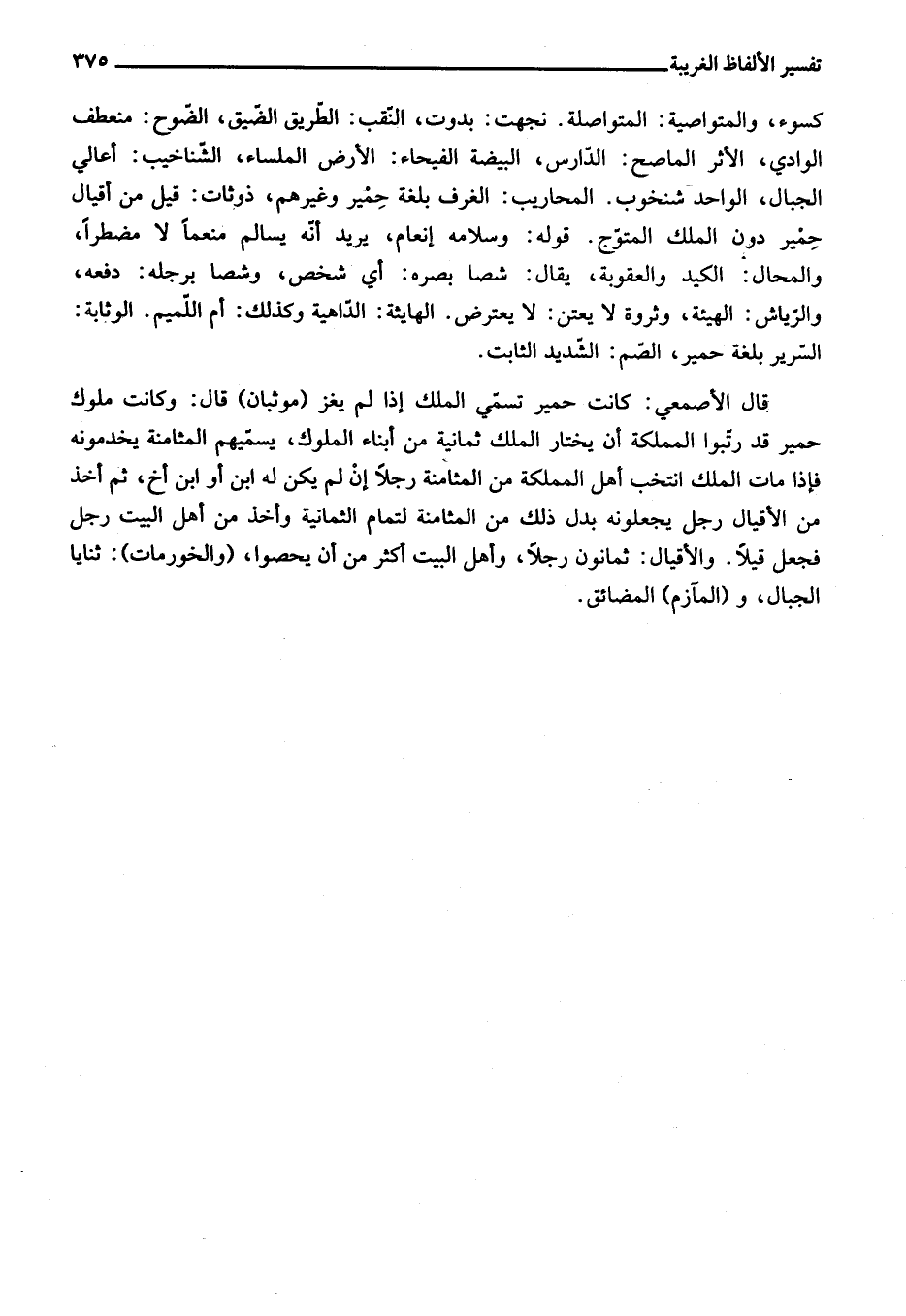 كسوء، والمتواصية: المتواصلة. نجهت: بدوت، النّقب: الطّريق الضّيق، الضّوح: منعطف الوادي، الأثر الماصح: الدّارس، البيضة الفيحاء: الأرض الملساء، الشّناخيب: أعالي الجبال، الواحد شنخوب. المحاريب: الغرف بلغة حمير وغيرهم، ذوثات: قيل من أقيال حمير دون الملك المتوّج. قوله: وسلامه إنعام، يريد أنّه يسالم منعما لا مضطرا، والمحال: الكيد والعقوبة، يقال: شصا بصره: أي شخص، وشصا برجله: دفعه، والرّياش: الهيئة، وثروة لا يعتن: لا يعترض. الهايثة: الدّاهية وكذلك: أم اللّميم. الوثابة: