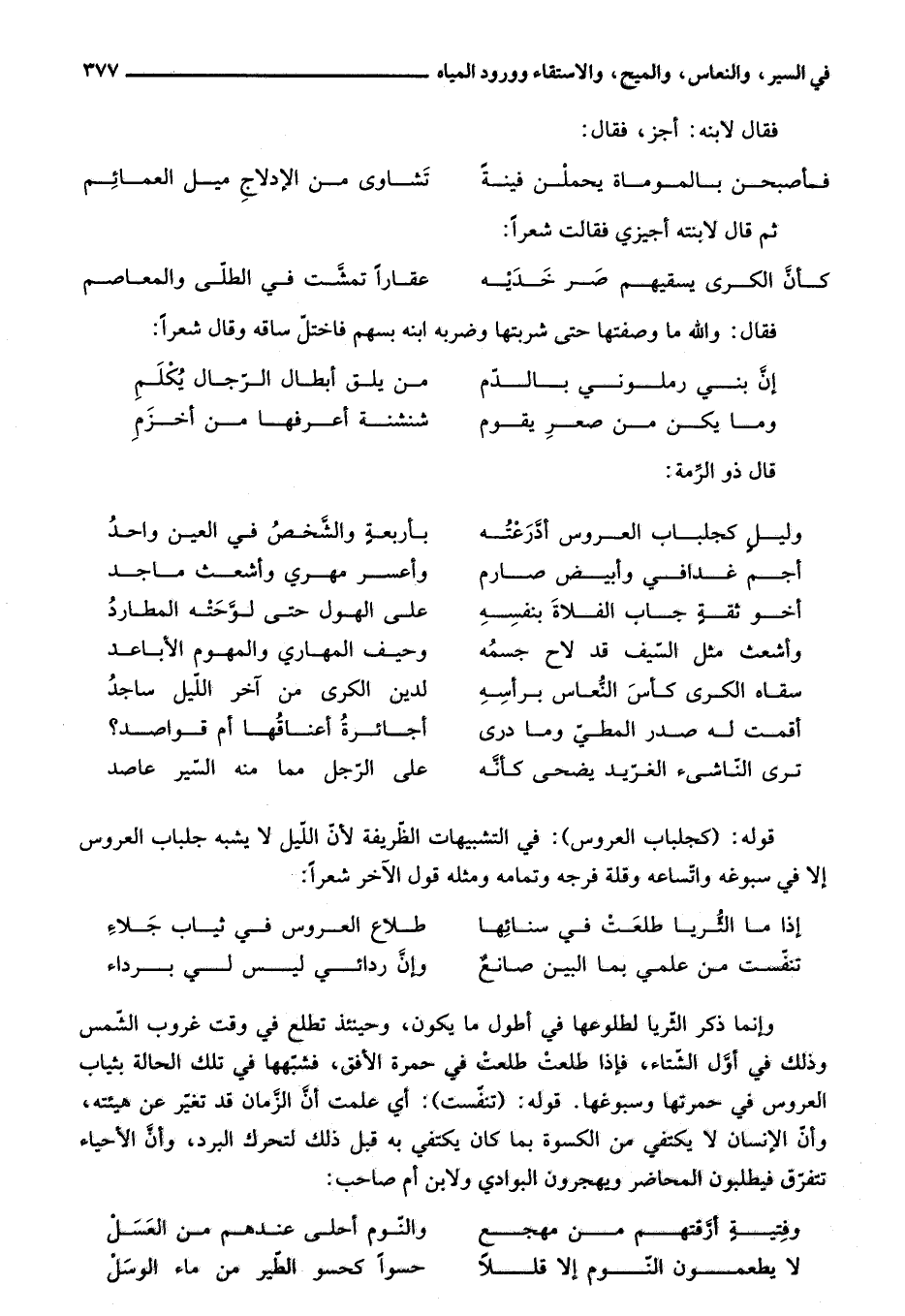 وإنما ذكر الثّريا لطلوعها في أطول ما يكون، وحينئذ تطلع في وقت غروب الشّمس وذلك في أوّل الشّتاء، فإذا طلعت طلعت في حمرة الأفق، فشبّهها في تلك الحالة بثياب العروس في حمرتها وسبوغها. قوله: (تنفّست) : أي علمت أنّ الزّمان قد تغيّر عن هيئته، وأنّ الإنسان لا يكتفي من الكسوة بما كان يكتفي به قبل ذلك لتحرك البرد، وأنّ الأحياء تتفرّق فيطلبون المحاضر ويهجرون البوادي ولابن أم صاحب:
