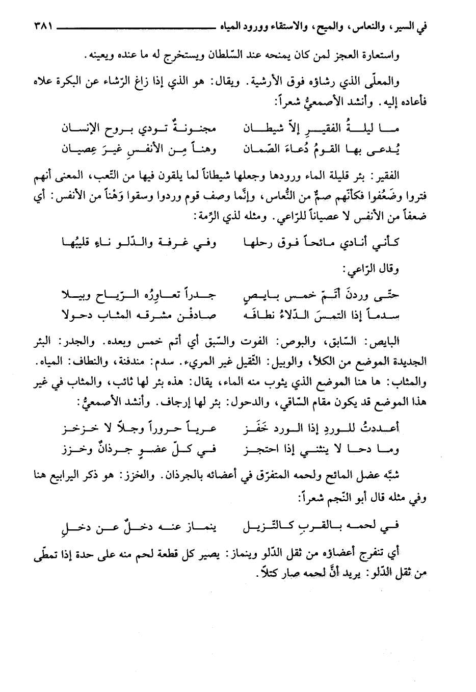 الفقير: بئر قليلة الماء ورودها وجعلها شيطانا لما يلقون فيها من التّعب، المعنى أنهم فتروا وضعفوا فكأنّهم صمّ من النّعاس، وإنّما وصف قوم وردوا وسقوا وهنا من الأنفس: أي ضعفا من الأنفس لا عصيانا للرّاعي. ومثله لذي الرّمة: