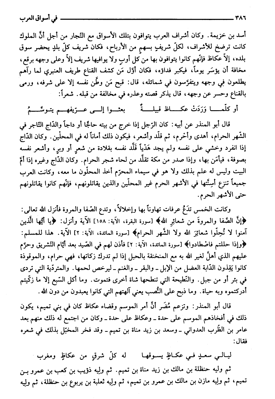 أسد بن خزيمة. وكان أشراف العرب يتوافون بتلك الأسواق مع التّجار من أجل أنّ الملوك كانت ترضخ للأشراف، لكلّ شريف بسهم من الأرباح، فكان شريف كلّ بلد يحضر سوق بلده، إلّا عكاظ فإنّهم كانوا يتوافون بها من كل أوب ولا يوافيها شريف إلّا وعلى وجهه برقع، مخافة أن يؤسر يوما، فيكبر فداؤه، فكان أوّل من كشف القناع طريف العنبري لما رآهم يطلعون في وجهه ويتفرّسون في شمائله، قال: قبح من وطّن نفسه إلا على شرفه، ورمى بالقناع وحسر عن وجهه، قال يذكر قصته وعذره في مخالفة من قبله. شعرا: