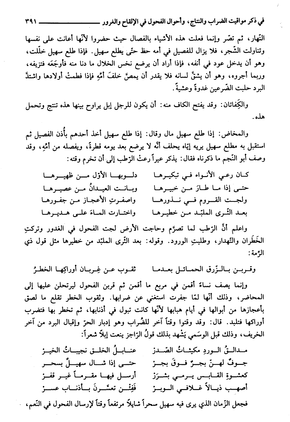 النّهار، ثم تصرّ وإنما فعلت هذه الأشياء بالفصال حيث حضروا لأنّها أعانت على نفسها وتناولت الشّجر، فلا يزال للفصيل في أمه حظ حتّى يطلع سهيل. فإذا طلع سهيل خلّلت، وهو أن يدخل عود في أنفه، فإذا أراد أن يرضع نخس الخلال ما دنا منه فأوجعه فتزيفه، وربما أجروه، وهو أن يشقّ لسانه فلا يقدر أن يمصّ خلف أمّه فإذا فطمت أولادها واشتدّ البرد حلبت الضّرعين غدوة وعشية.