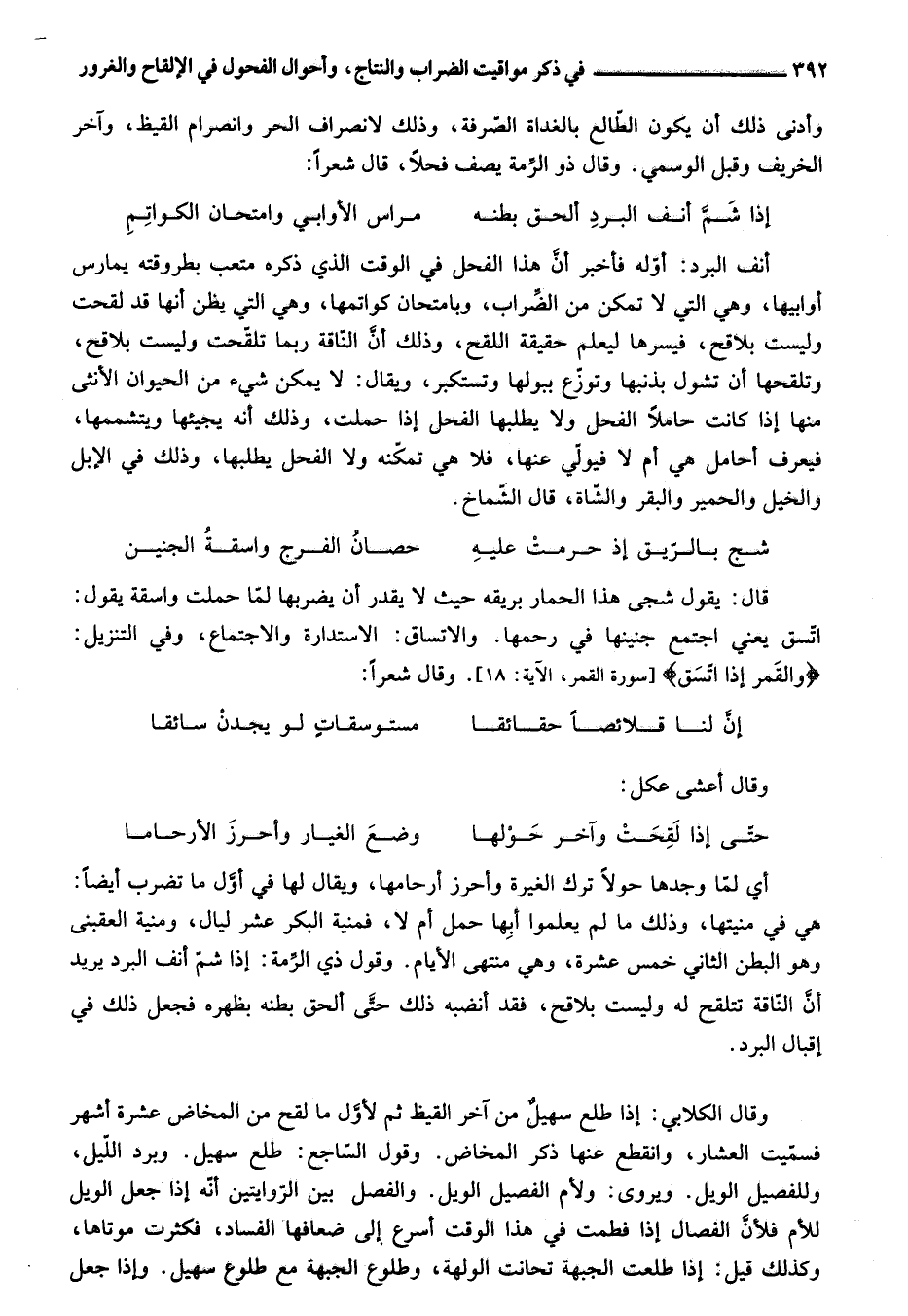 وقال الكلابي: إذا طلع سهيل من آخر القيظ ثم لأوّل ما لقح من المخاض عشرة أشهر فسمّيت العشار، وانقطع عنها ذكر المخاض. وقول السّاجع: طلع سهيل. وبرد اللّيل، وللفصيل الويل. ويروى: ولأم الفصيل الويل. والفصل بين الرّوايتين أنّه إذا جعل الويل للأم فلأنّ الفصال إذا فطمت في هذا الوقت أسرع إلى ضعافها الفساد، فكثرت موتاها، وكذلك قيل: إذا طلعت الجبهة تحانت الولهة، وطلوع الجبهة مع طلوع سهيل. وإذا جعل
