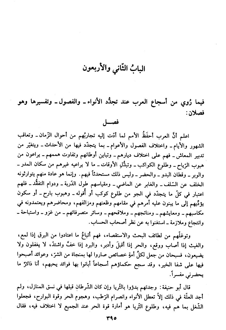 اعلم أنّ العرب أحفظ الأمم لما أدّت إليه تجاربهم من أحوال الزّمان- وتعاقب الشهور والأيام- واختلاف الفصول والأعوام- بما يتجدّد فيها من الأحداث- ويتغيّر من تدبير المعاش- فهم على اختلاف ديارهم- وتباين أوطانهم وتفاوت هممهم- يراعون من هبوب الرّياح- وطلوع الكواكب- وتبدّل الأوقات- ما لا يراعيه غيرهم من سكان المدر- والوبر- وقطان البدو- والحضر- وليس ذلك مستحدثا فيهم. وإنما هو عادة منهم يتوارثونه الخلف عن السّلف- والغابر عن الماضي- ومقياسهم طول الدّربة- ودوام التفقّد- فلهم اعتبار في كلّ ما يتجدّد في الجو من طلوع كوكب أو أفوله- وهبوب بارح- أو سكون يؤدّيهم إلى ما يبنون عليه أمرهم في مقامهم وظعنهم ومزالفهم، ومحاضرهم ويعتمدونه في مكاسبهم- ومعايشهم- ومناتجهم- وملاقحهم- وسائر متصرفاتهم- من غزو- واستباحة- وانتجاع وملازمة- استغنوا به عن نظر أصحاب الحساب.