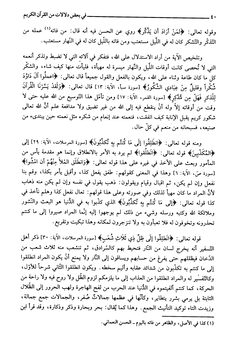 [سورة المرسلات، الآية: 30] ذكر أهل التّفسير أنه يخرج لسان من النّار فتحيط بهم كالسّرادق، ثم تنشعب منه ثلاث شعب من الدّخان فيظللهم حتى يفرغ من حسابهم ويساقون إلى النّار ولا يمنع أنّ يكون المراد انطلقوا إلى ما كنتم به تكذّبون من شدائد عقابه وأليم سخطه. ويكون انطلقوا الثّاني شرحا للأوّل، وكالتّفسير له والمراد انطلقوا من العذاب إلى ما يلزمكم لزوم الظّل ولا روح فيه ولا راحة من الحركة، كما كنتم ألفيتموه في الدّنيا عند الحرب من لفح الهاجرة ولهب الحرور إلى الظّلال الثابتة بل يرمي بشرر يتطاير، وكأنّها في عظمها جمالات صفر، والجمالات جمع جمالة، وزيدت التاء توكيد التأنيث الجمع. وهذا كما يقال: بحر وبحارة وذكر وذكارة، وقد قرأ ابن