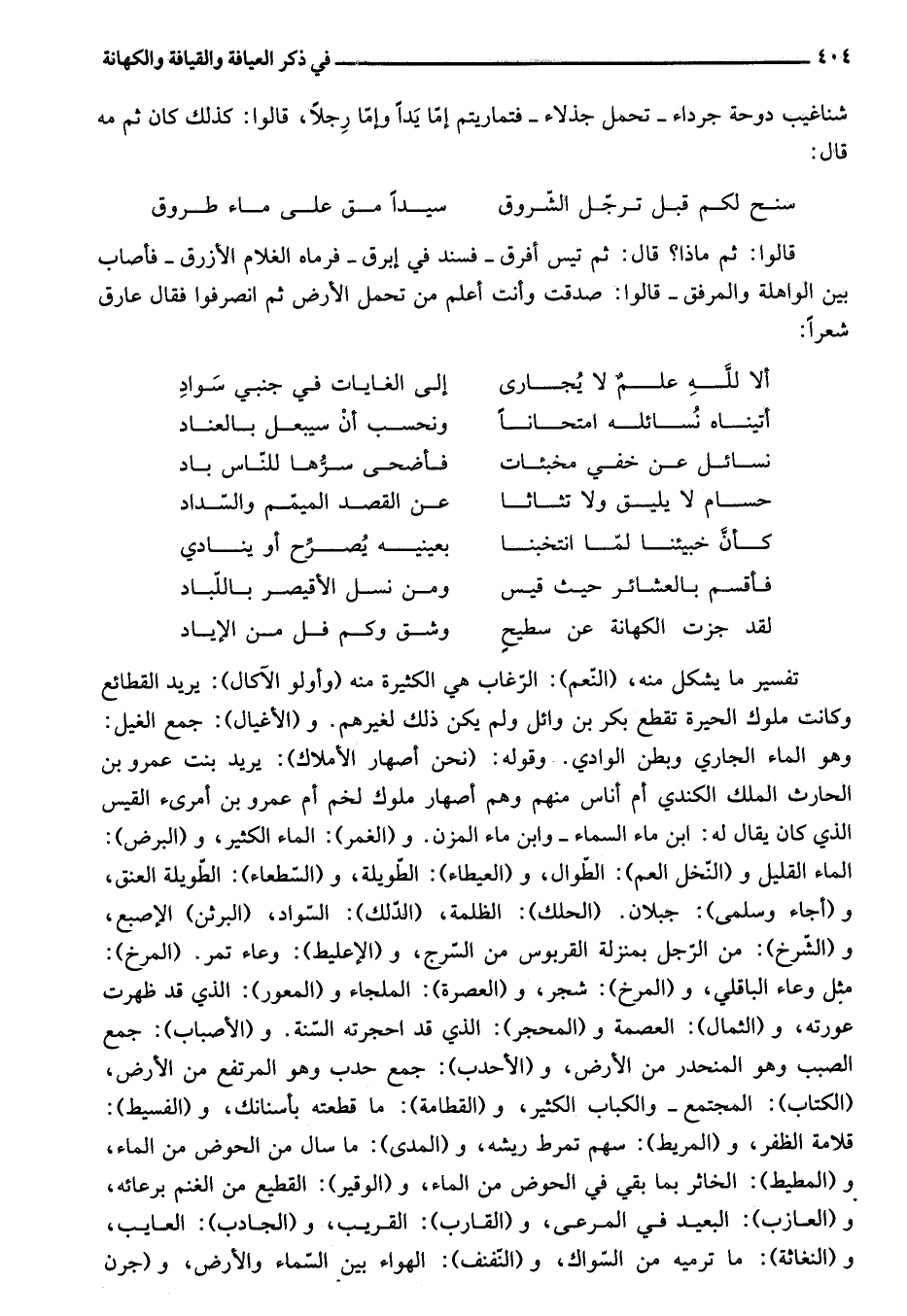 تفسير ما يشكل منه، (النّعم) : الرّغاب هي الكثيرة منه (وأولو الآكال) : يريد القطائع وكانت ملوك الحيرة تقطع بكر بن وائل ولم يكن ذلك لغيرهم. و (الأغيال) : جمع الغيل: