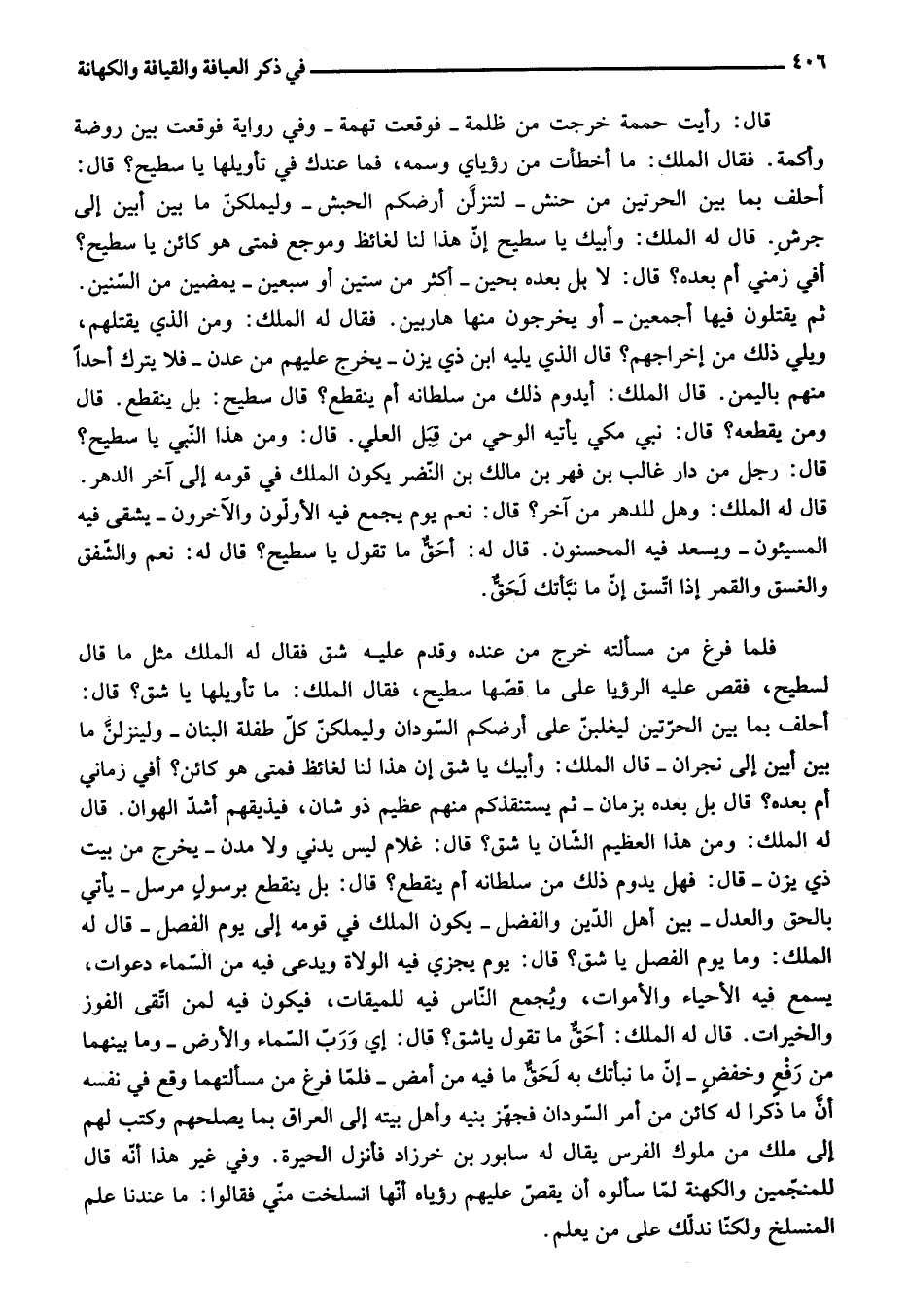 قال له الملك: وهل للدهر من آخر؟ قال: نعم يوم يجمع فيه الأوّلون والآخرون- يشقى فيه المسيئون- ويسعد فيه المحسنون. قال له: أحقّ ما تقول يا سطيح؟ قال له: نعم والشّفق والغسق والقمر إذا اتّسق إنّ ما نبّأتك لحقّ.