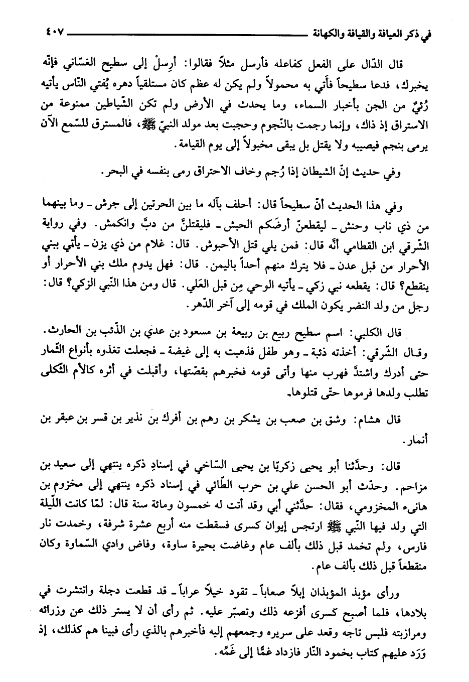 قال: وحدّثنا أبو يحيى زكريّا بن يحيى السّاخي في إسناد ذكره ينتهي إلى سعيد بن مزاحم. وحدّث أبو الحسن علي بن حرب الطّائي في إسناد ذكره ينتهي إلى مخزوم بن هانىء المخزومي، فقال: حدّثني أبي وقد أتت له خمسون ومائة سنة قال: لمّا كانت اللّيلة التي ولد فيها النّبي صلى الله عليه وسلم ارتجس إيوان كسرى فسقطت منه أربع عشرة شرفة، وخمدت نار فارس، ولم تخمد قبل ذلك بألف عام وغاضت بحيرة ساوة، وفاض وادي السّماوة وكان منقطعا قبل ذلك بألف عام.