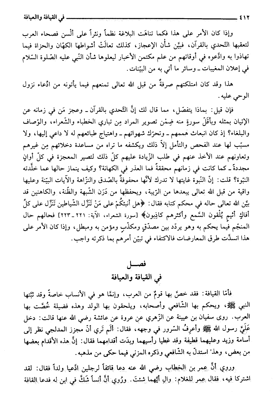 فأمّا القيافة: فقد خصّ بها قوم من العرب، وإنّما هو في الأنساب خاصة وقد ثبّتها النبي صلى الله عليه وسلم، ويحكم بها الشّافعي وأصحابه، ويلحقون بها الولد وهذه فضيلة خصّت بها العرب. روى سفيان بن عيينة عن الزّهري عن عروة عن عائشة رضي الله عنها قالت: دخل عليّ رسول الله صلى الله عليه وسلم وأعرف السّرور في وجهه، فقال: ألم تري أنّ مجزز المدلجي نظر إلى أسامة وزيد وعليهما قطيفة وقد غطيا رأسيهما وبدت أقدامهما فقال: إنّ هذه الأقدام بعضها من بعض، وهذا استدلّ به الشّافعي وذكره المزني فيما حكى من مذهبه.