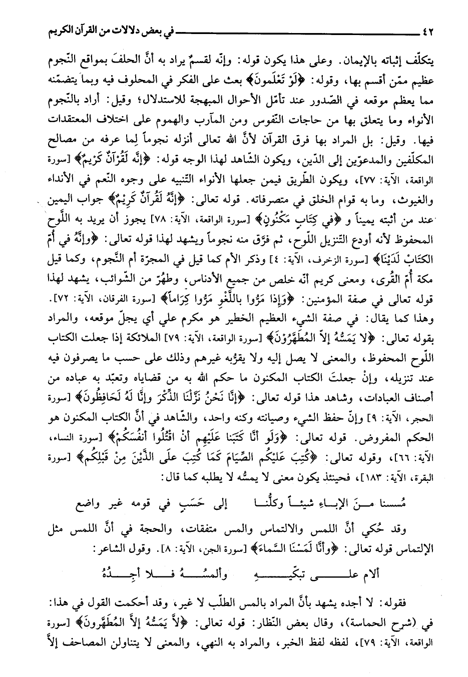 [سورة الواقعة، الآية: 77] ، ويكون الطّريق فيمن جعلها الأنواء التّنبيه على وجوه النّعم في الأنداء والغيوث، وما به قوام الخلق في متصرفاته. قوله تعالى: إِنَّهُ لَقُرْآنٌ كَرِيمٌ