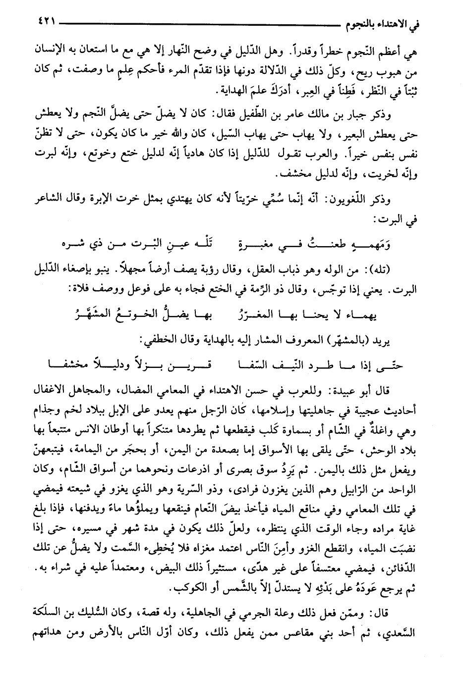 قال أبو عبيدة: وللعرب في حسن الاهتداء في المعامي المضال، والمجاهل الاغفال أحاديث عجيبة في جاهليتها وإسلامها، كان الرّجل منهم يعدو على الإبل ببلاد لخم وجذام وهي واغلة في الشّام أو بسماوة كلب فيقطعها ثم يطردها متنكرا بها أوطان الانس متتبعا بها بلاد الوحش، حتّى يلقى بها الأسواق إما بصعدة من اليمن، أو بحجر من اليمامة، فيتبعهنّ ويفعل مثل ذلك باليمن. ثم يرد سوق بصرى أو اذرعات ونحوهما من أسواق الشّام، وكان الواحد من الرّابيل وهم الذين يغزون فرادى، وذو السّرية وهو الذي يغزو في شيعته فيمضي في تلك المعامي وفي مناقع المياه فيأخذ بيض النّعام فينقعها ويملؤها ماء ويدفنها، فإذا بلغ غاية مراده وجاء الوقت الذي ينتظره، ولعلّ ذلك يكون في مدة شهر في مسيره، حتى إذا نضبت المياه، وانقطع الغزو وأمن النّاس اعتمد مغزاه فلا يخطئ السّمت ولا يضلّ عن تلك الدّفائن، فيمضي معتسفا على غير هدى، مستثيرا ذلك البيض، ومعتمدا عليه في شراء به.