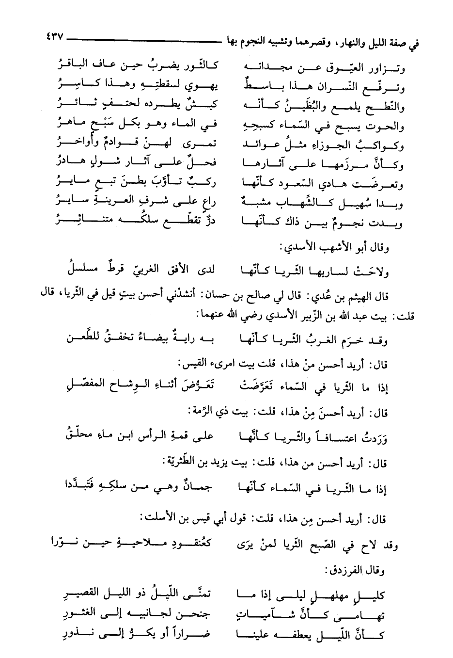 قال الهيثم بن عدي: قال لي صالح بن حسان: أنشدني أحسن بيت قيل في الثّريا، قال قلت: بيت عبد الله بن الزّبير الأسدي رضي الله عنهما: