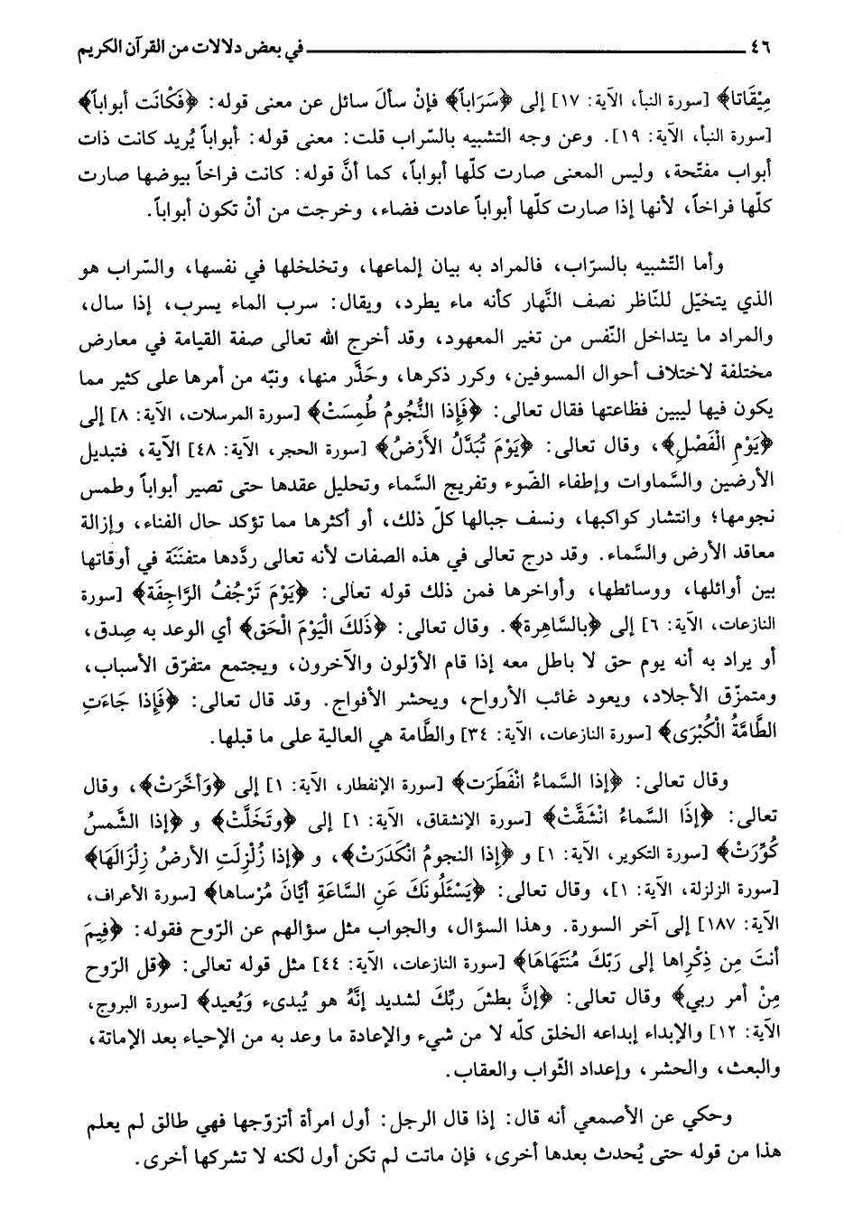 وأما التّشبيه بالسرّاب، فالمراد به بيان إلماعها، وتخلخلها في نفسها، والسّراب هو الذي يتخيّل للنّاظر نصف النّهار كأنه ماء يطرد، ويقال: سرب الماء يسرب، إذا سال، والمراد ما يتداخل النّفس من تغير المعهود، وقد أخرج الله تعالى صفة القيامة في معارض مختلفة لا ختلاف أحوال المسوفين، وكرر ذكرها، وحذّر منها، ونبّه من أمرها على كثير مما يكون فيها ليبين فظاعتها فقال تعالى: فَإِذَا النُّجُومُ طُمِسَتْ