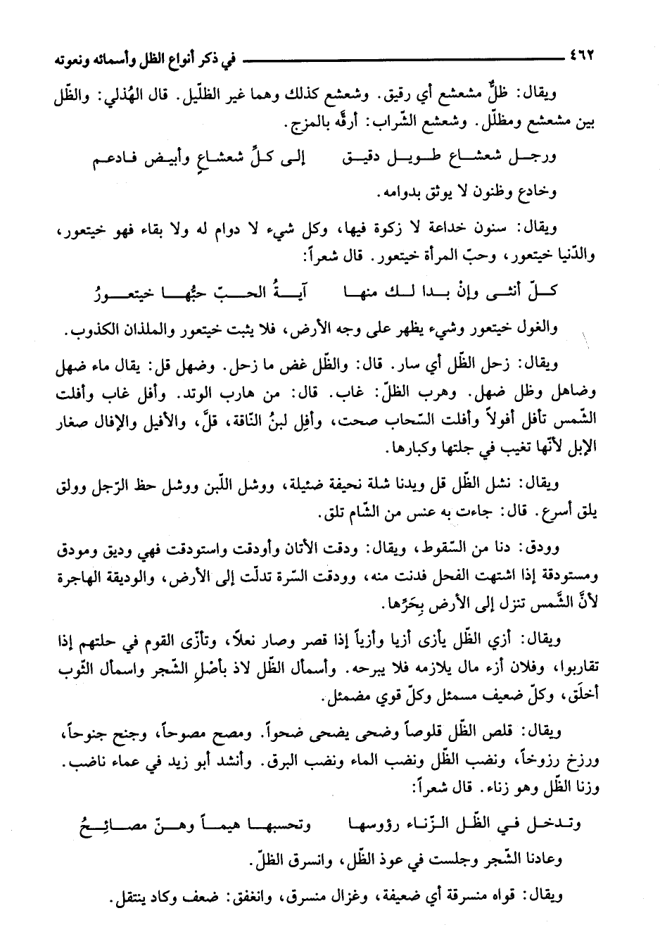 ويقال: قلص الظّل قلوصا وضحى يضحى ضحوا. ومصح مصوحا، وجنح جنوحا، ورزخ رزوخا، ونضب الظّل ونضب الماء ونضب البرق. وأنشد أبو زيد في عماء ناضب.