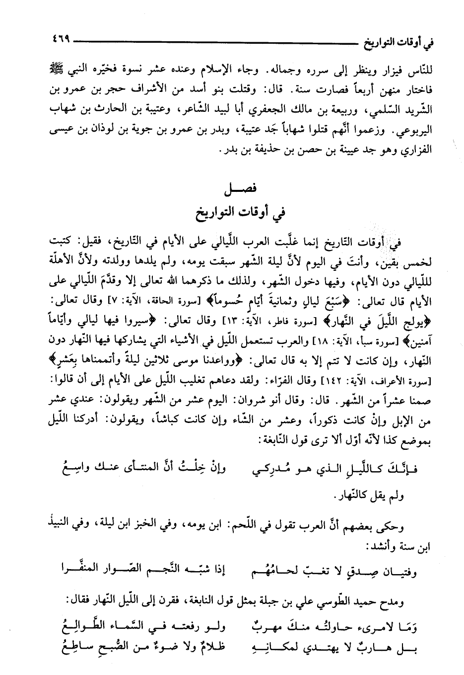 في أوقات التّاريخ إنما غلّبت العرب اللّيالي على الأيام في التّاريخ، فقيل: كتبت لخمس بقين، وأنت في اليوم لأنّ ليلة الشّهر سبقت يومه، ولم يلدها وولدته ولأنّ الأهلّة لللّيالي دون الأيام، وفيها دخول الشّهر، ولذلك ما ذكرهما الله تعالى إلا وقدّم اللّيالي على الأيام قال تعالى: سَبْعَ لَيالٍ وَثَمانِيَةَ أَيَّامٍ حُسُوماً