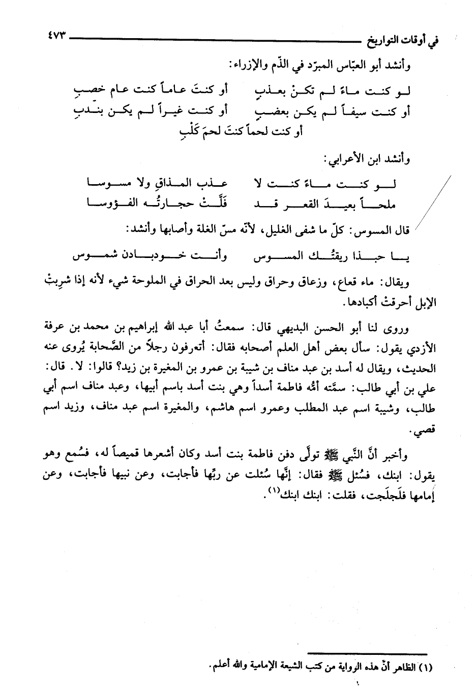 وأخبر أنّ النّبي صلى الله عليه وسلم تولّى دفن فاطمة بنت أسد وكان أشعرها قميصا له، فسمع وهو يقول: ابنك، فسئل صلى الله عليه وسلم فقال: إنّها سئلت عن ربّها فأجابت، وعن نبيها فأجابت، وعن إمامها فلجلجت، فقلت: ابنك ابنك «1» .