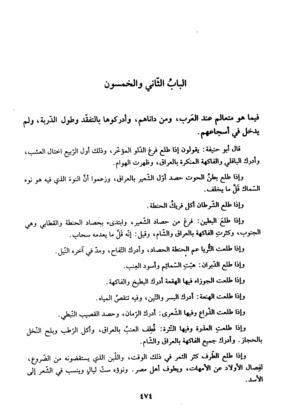 الباب الثّاني والخمسون فيما هو متعالم عند العرب، ومن داناهم، وأدركوها بالتفقّد وطول الدّربة ولم يدخل في أسجاعهم