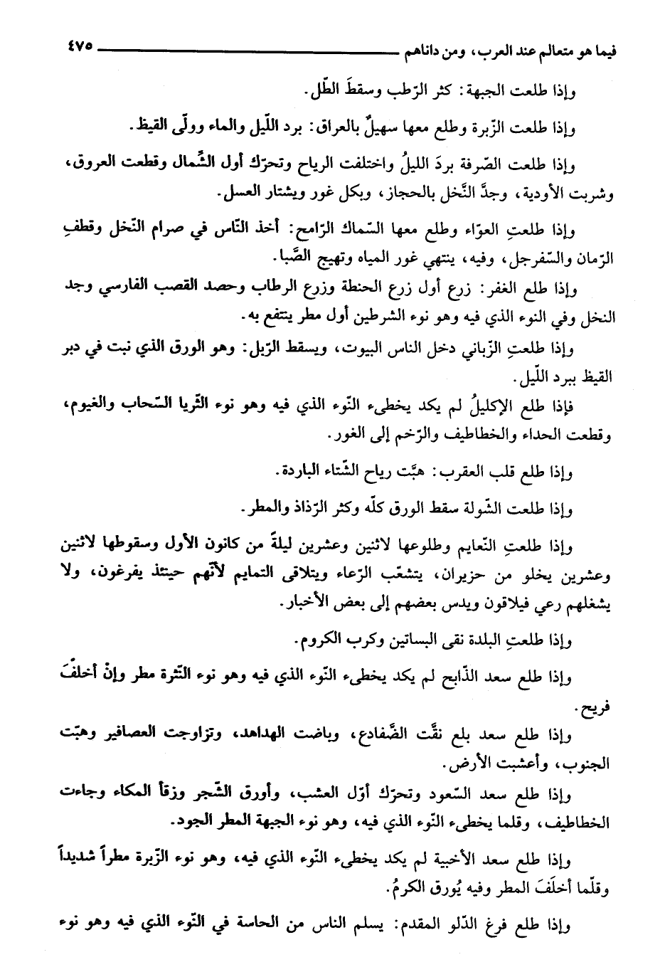 فإذا طلع الإكليل لم يكد يخطئ النّوء الذي فيه وهو نوء الثّريا السّحاب والغيوم، وقطعت الحداء والخطاطيف والرّخم إلى الغور.