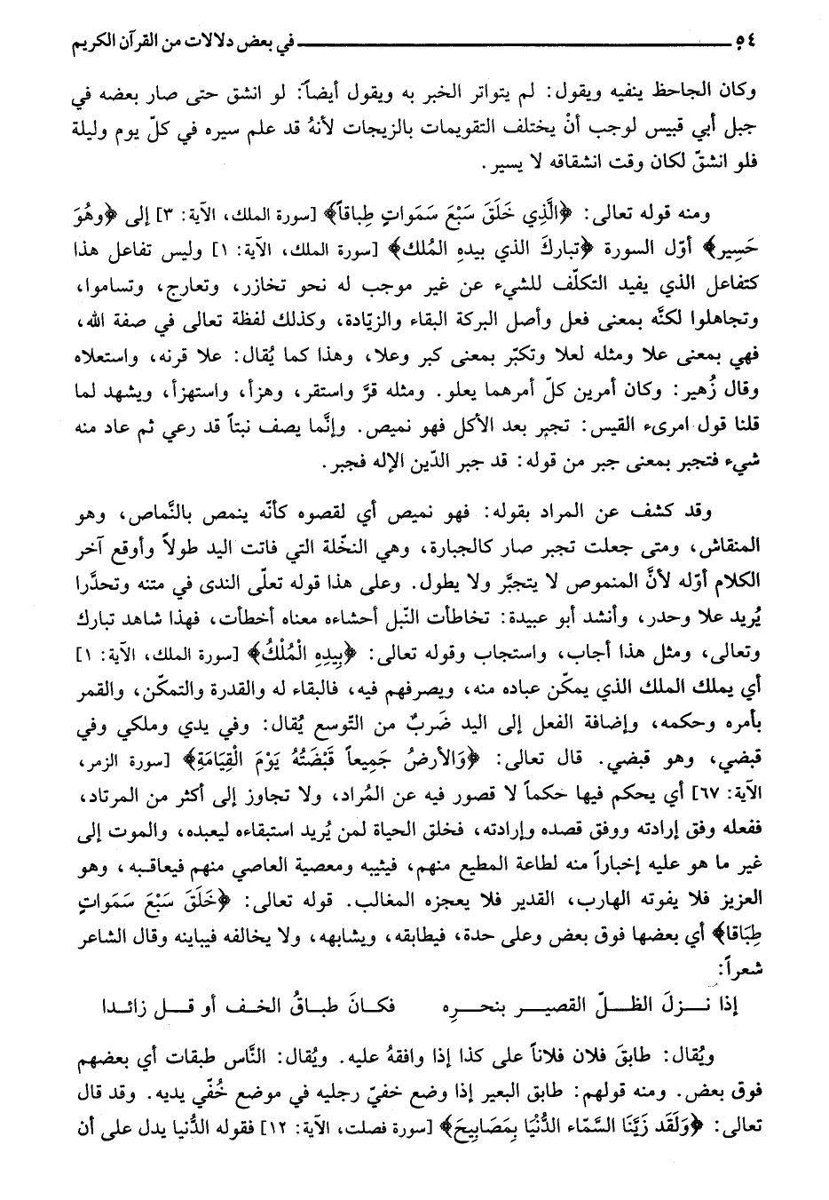[سورة الملك، الآية: 1] وليس تفاعل هذا كتفاعل الذي يفيد التكلّف للشيء عن غير موجب له نحو تخازر، وتعارج، وتساموا، وتجاهلوا لكنّه بمعنى فعل وأصل البركة البقاء والزيّادة، وكذلك لفظة تعالى في صفة الله، فهي بمعنى علا ومثله لعلا وتكبّر بمعنى كبر وعلا، وهذا كما يقال: علا قرنه، واستعلاه وقال زهير: وكان أمرين كلّ أمرهما يعلو. ومثله قرّ واستقر، وهزأ، واستهزأ، ويشهد لما قلنا قول امرئ القيس: تجبر بعد الأكل فهو نميص. وإنّما يصف نبتا قد رعي ثم عاد منه شيء فتجبر بمعنى جبر من قوله: قد جبر الدّين الإله فجبر.