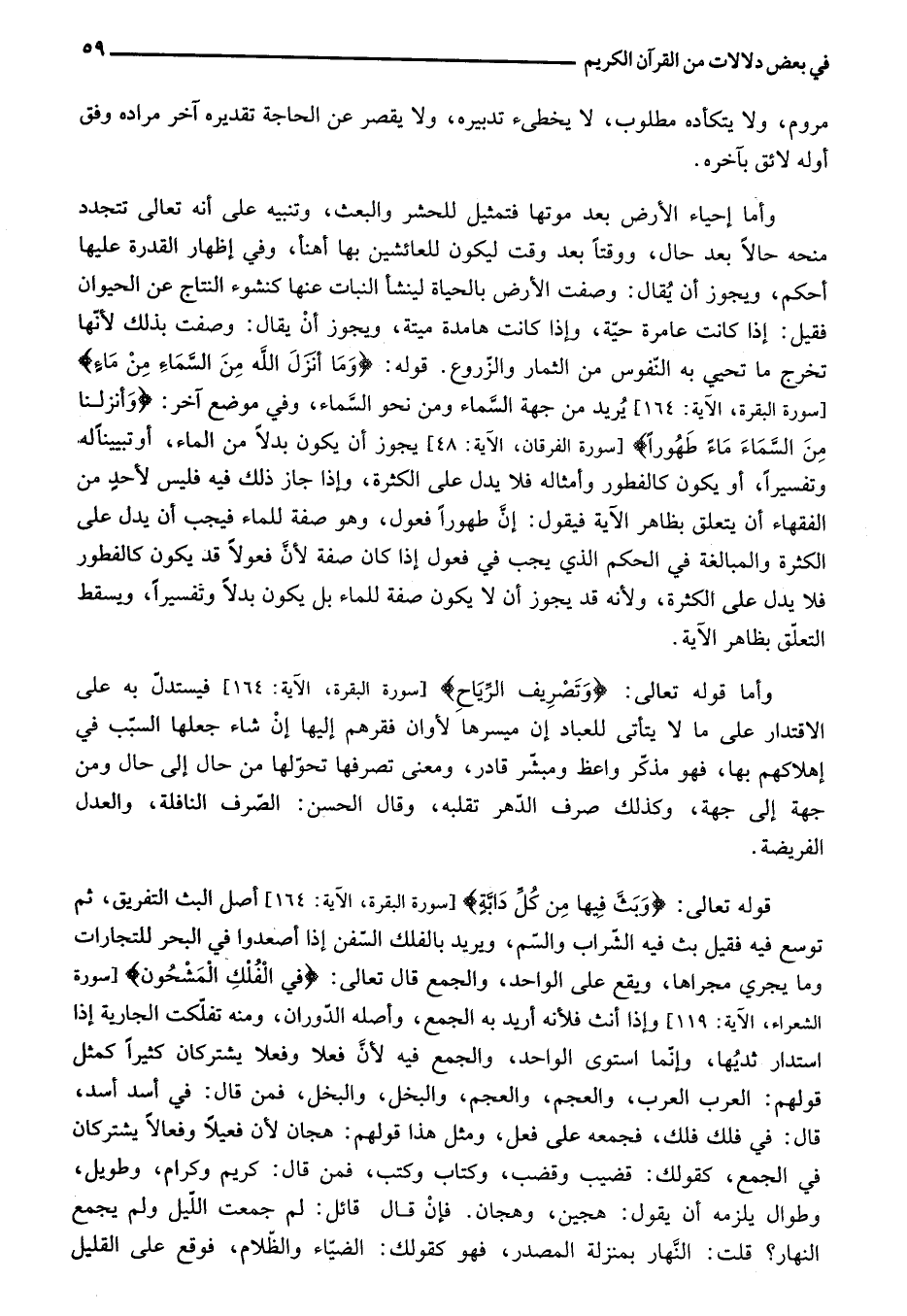 [سورة الفرقان، الآية: 48] يجوز أن يكون بدلا من الماء، أو تبيينا له وتفسيرا، أو يكون كالفطور وأمثاله فلا يدل على الكثرة، وإذا جاز ذلك فيه فليس لأحد من الفقهاء أن يتعلق بظاهر الآية فيقول: إنّ طهورا فعول، وهو صفة للماء فيجب أن يدل على الكثرة والمبالغة في الحكم الذي يجب في فعول إذا كان صفة لأنّ فعولا قد يكون كالفطور فلا يدل على الكثرة، ولأنه قد يجوز أن لا يكون صفة للماء بل يكون بدلا وتفسيرا، ويسقط التعلّق بظاهر الآية.