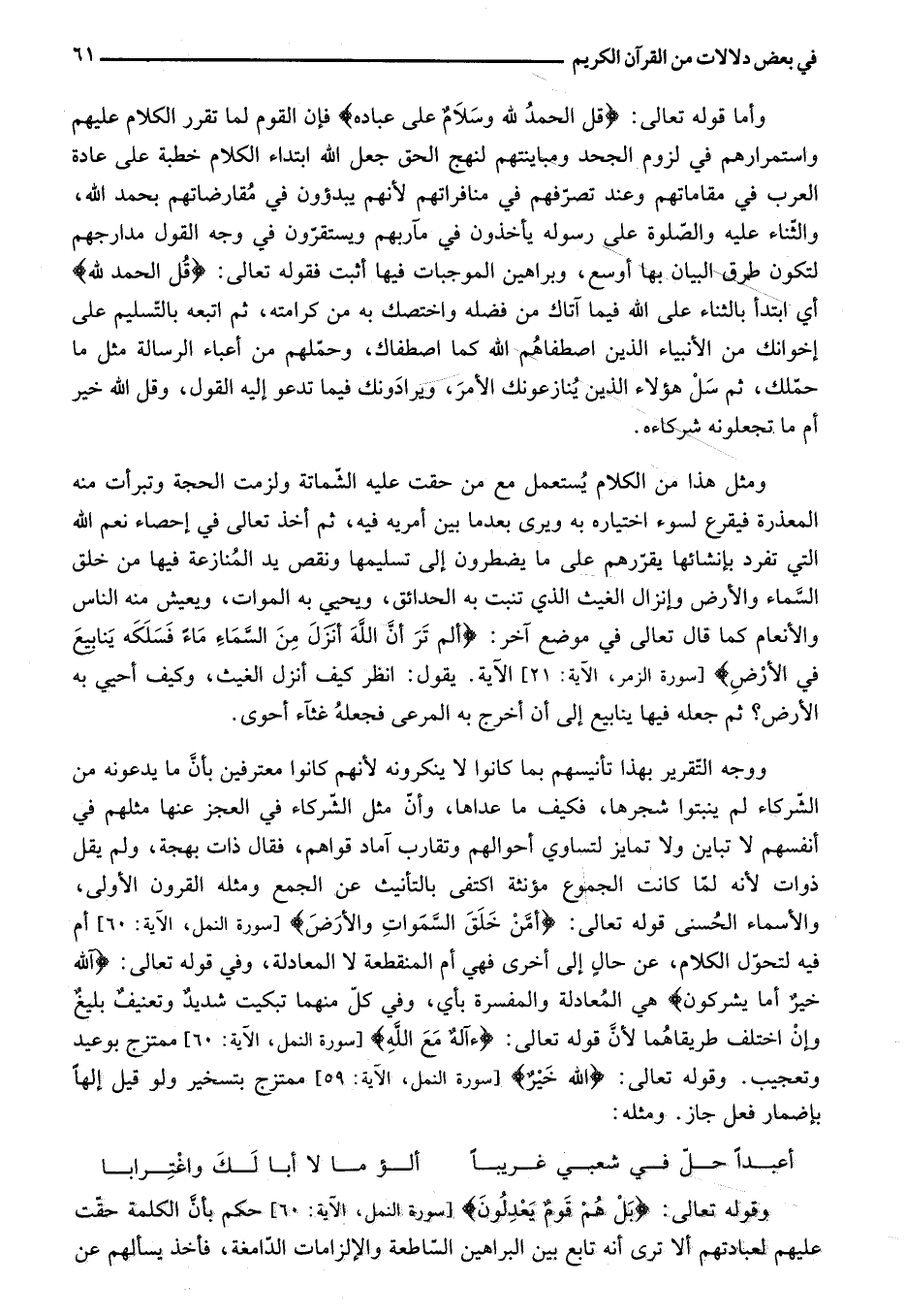 [سورة النمل، الآية: 60] حكم بأنّ الكلمة حقّت عليهم لعبادتهم ألا ترى أنه تابع بين البراهين السّاطعة والإلزامات الدّامغة، فأخذ يسألهم عن