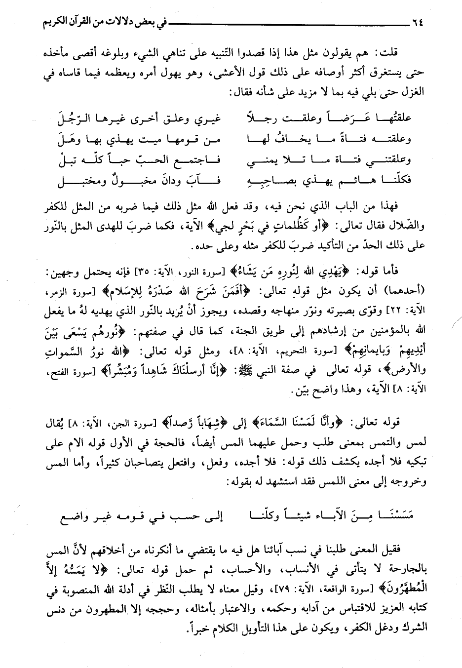 [سورة الواقعة، الآية: 79] ، وقيل معناه لا يطلب النّظر في أدلة الله المنصوبة في كتابه العزيز للاقتباس من آدابه وحكمه، والاعتبار بأمثاله، وحججه إلا المطهرون من دنس الشرك ودغل الكفر، ويكون على هذا التأويل الكلام خبرا.