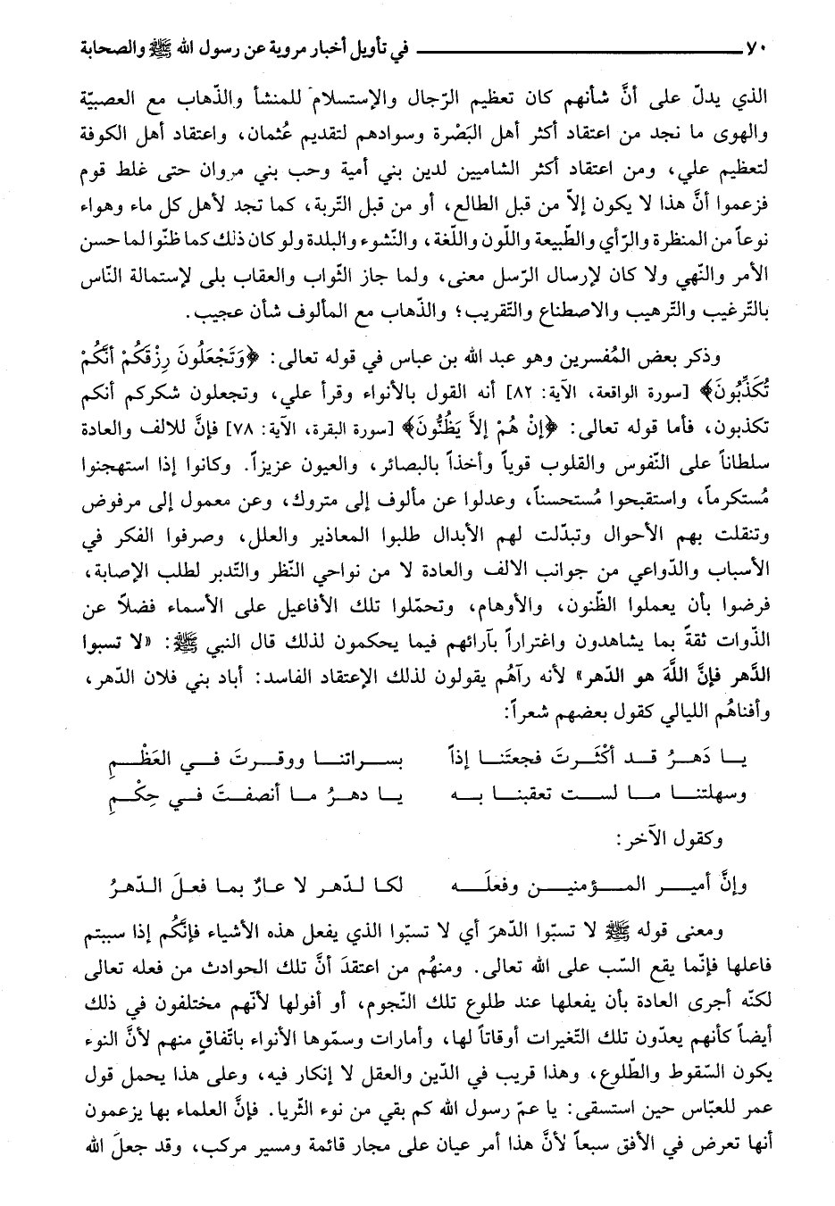 ومعنى قوله صلى الله عليه وسلم لا تسبّوا الدّهر أي لا تسبّوا الذي يفعل هذه الأشياء فإنّكم إذا سببتم فاعلها فإنّما يقع السّب على الله تعالى. ومنهم من اعتقد أنّ تلك الحوادث من فعله تعالى لكنّه أجرى العادة بأن يفعلها عند طلوع تلك النّجوم، أو أفولها لأنّهم مختلفون في ذلك أيضا كأنهم يعدّون تلك التّغيرات أوقاتا لها، وأمارات وسمّوها الأنواء باتّفاق منهم لأنّ النوء يكون السّقوط والطّلوع، وهذا قريب في الدّين والعقل لا إنكار فيه، وعلى هذا يحمل قول عمر للعبّاس حين استسقى: يا عمّ رسول الله كم بقي من نوء الثّريا. فإنّ العلماء بها يزعمون أنها تعرض في الأفق سبعا لأنّ هذا أمر عيان على مجار قائمة ومسير مركب، وقد جعل الله