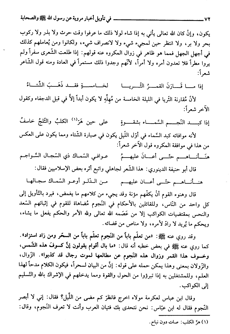 كما روي عنه صلى الله عليه وسلم في بعض خطبه أنه قال: «ما بال أقوام يقولون إنّ كسوف هذه الشّمس، وخسوف هذا القمر وزوال هذه النّجوم عن مطالعها لموت رجال قد كذبوا» . الزّوال، والزّولان بمعنى وهذا يمكن حمله على قوله: إنّ من البيان لسحرا، فيكون الكلام مدحا لهذا العلم، وللمشتغلين به إذا تبرءوا من الحول والقوة ومما يدخلهم في الإشراك بالله والتّسليم إلى الكواكب.