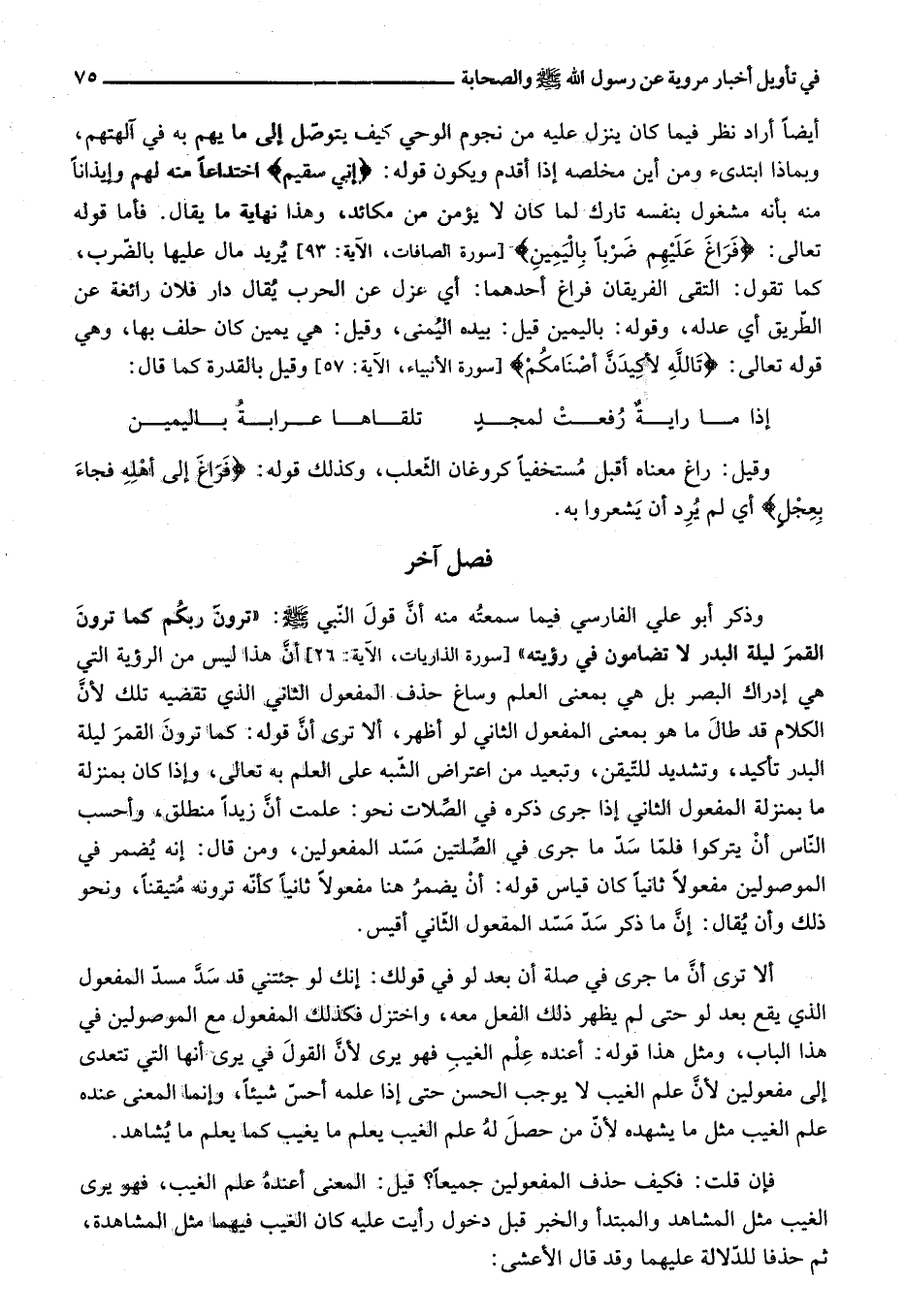 وذكر أبو علي الفارسي فيما سمعته منه أنّ قول النّبي صلى الله عليه وسلم: «ترون ربكم كما ترون القمر ليلة البدر لا تضامون في رؤيته» [سورة الذاريات، الآية: 26] أنّ هذا ليس من الرؤية التي هي إدراك البصر بل هي بمعنى العلم وساغ حذف المفعول الثاني الذي تقضيه تلك لأنّ الكلام قد طال ما هو بمعنى المفعول الثاني لو أظهر، ألا ترى أنّ قوله: كما ترون القمر ليلة البدر تأكيد، وتشديد للتّيقن، وتبعيد من اعتراض الشّبه على العلم به تعالى، وإذا كان بمنزلة ما بمنزلة المفعول الثاني إذا جرى ذكره في الصّلات نحو: علمت أنّ زيدا منطلق، وأحسب النّاس أن يتركوا فلمّا سدّ ما جرى في الصّلتين مسد المفعولين، ومن قال: إنه يضمر في الموصولين مفعولا ثانيا كان قياس قوله: أن يضمر هنا مفعولا ثانيا كأنّه ترونه متيقنا، ونحو ذلك وأن يقال: إنّ ما ذكر سدّ مسد المفعول الثّاني أقيس.