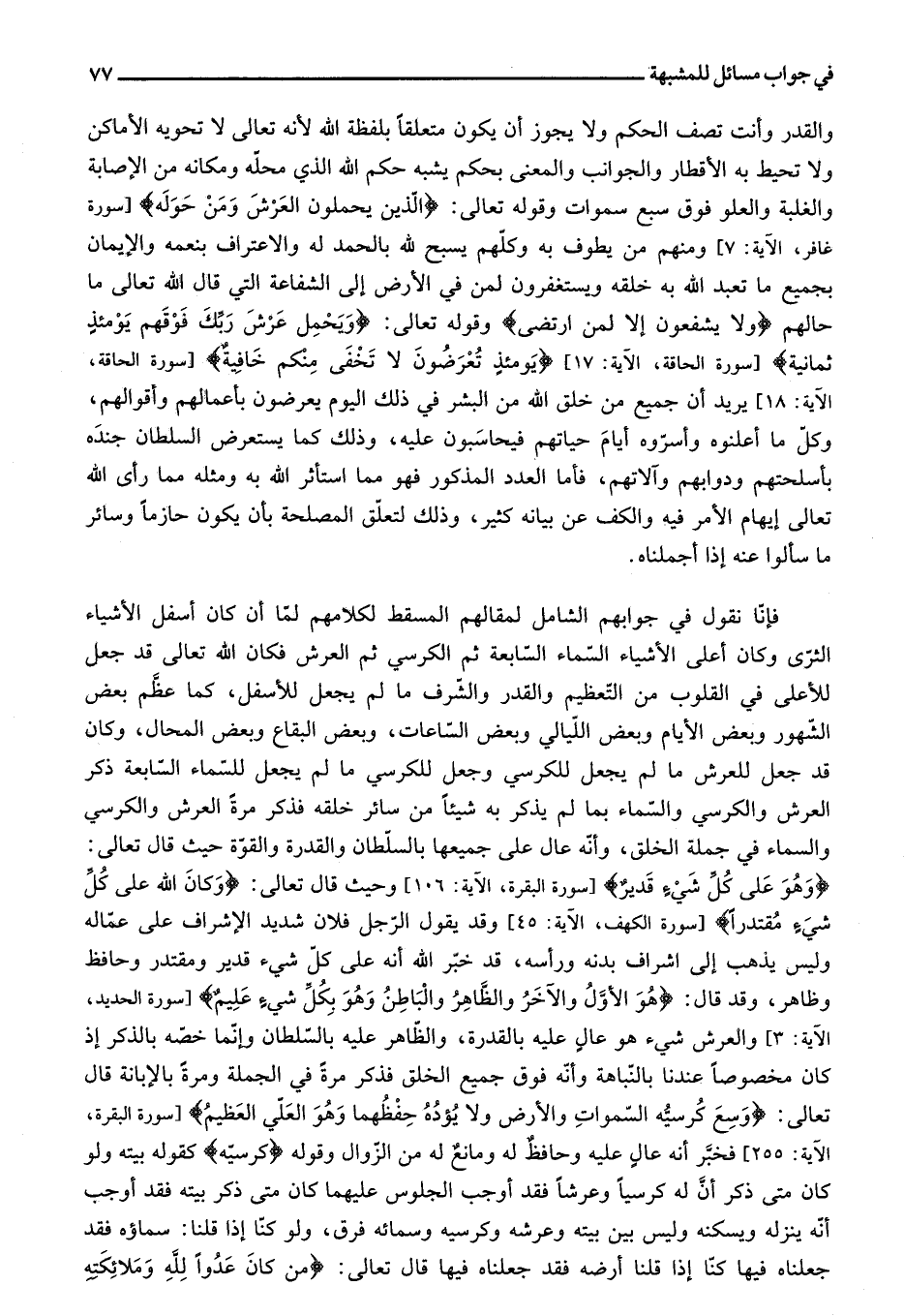 فإنّا نقول في جوابهم الشامل لمقالهم المسقط لكلامهم لمّا أن كان أسفل الأشياء الثّرى وكان أعلى الأشياء السّماء السّابعة ثم الكرسي ثم العرش فكان الله تعالى قد جعل للأعلى في القلوب من التّعظيم والقدر والشّرف ما لم يجعل للأسفل، كما عظّم بعض الشّهور وبعض الأيام وبعض اللّيالي وبعض السّاعات، وبعض البقاع وبعض المحال، وكان قد جعل للعرش ما لم يجعل للكرسي وجعل للكرسي ما لم يجعل للسّماء السّابعة ذكر العرش والكرسي والسّماء بما لم يذكر به شيئا من سائر خلقه فذكر مرة العرش والكرسي والسماء في جملة الخلق، وأنّه عال على جميعها بالسلطان والقدرة والقوّة حيث قال تعالى:
