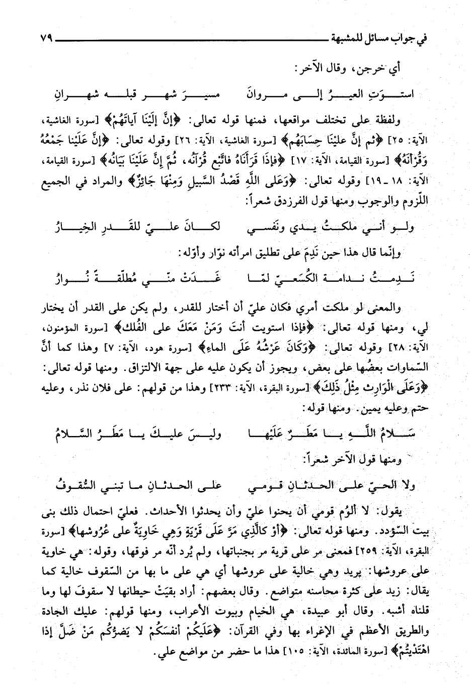يقول: لا ألوم قومي أن يحنوا عليّ وأن يحدثوا الأحداث. فعليّ احتمال ذلك بنى بيت السّؤدد. ومنها قوله تعالى: أَوْ كَالَّذِي مَرَّ عَلى قَرْيَةٍ وَهِيَ خاوِيَةٌ عَلى عُرُوشِها
