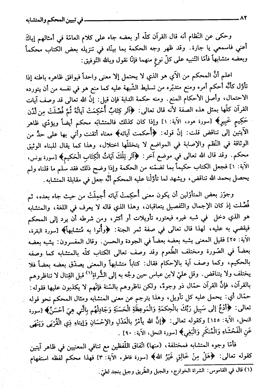 [سورة البقرة، الآية: 25] فقيل المعنى يشبه بعضه بعضا في الجودة والحسن. وقال المفسرون: يشبه بعضه بعضا في الصّورة ومختلف الطعوم وقد وصف تعالى الكتاب كلّه بالمتشابه كما وصفه بالحكيم، وكما وصف آية بالإحكام فقال: كتابا متشابها والمعنى يصدّق بعضه بعضا فلا يختلف ولا يتناقض. وقل عليّ لابن عباس حين وجّه به إلى الشّراة «1» قبل القتال لا تناظروهم بالقرآن، فإنّ القرآن حمّال ذو وجوه، ولكن ناظروهم بالسّنة فإنّهم لا يكذبون عليها فقوله: